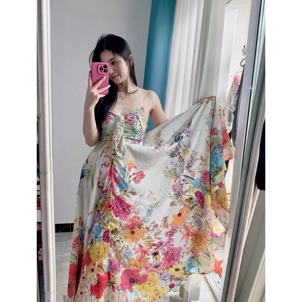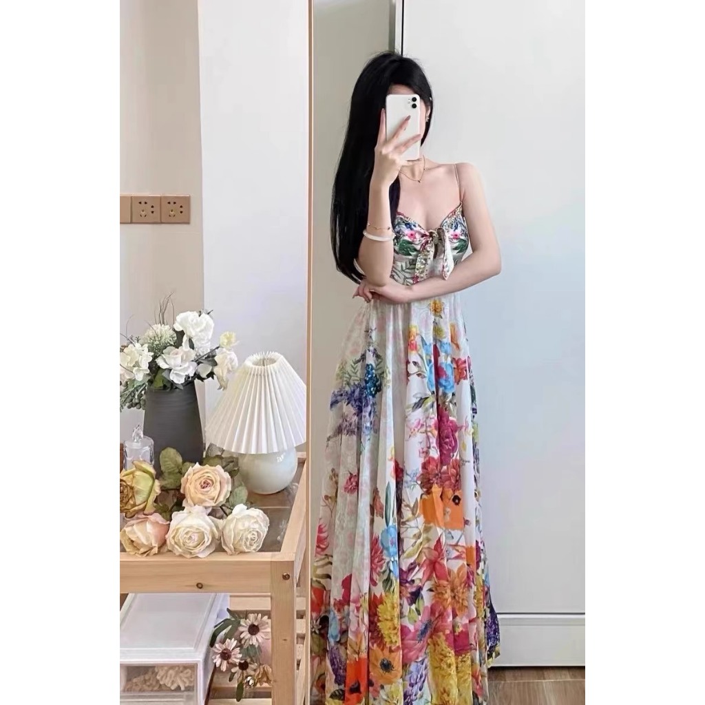 (HÀNG SẴN) Váy maxi hai dây màu hoa tranh vẽ đi biển điệu đà xòe rộng dài gót chân mùa hè hàng Quảng Châu loại 1
