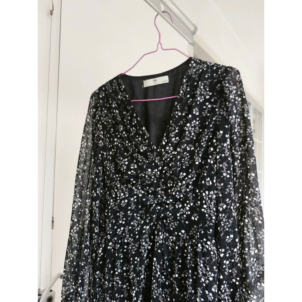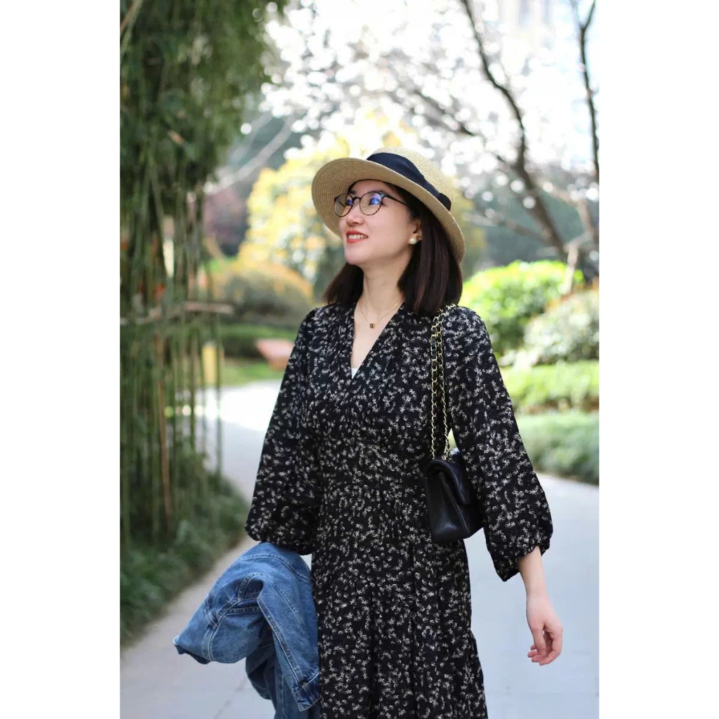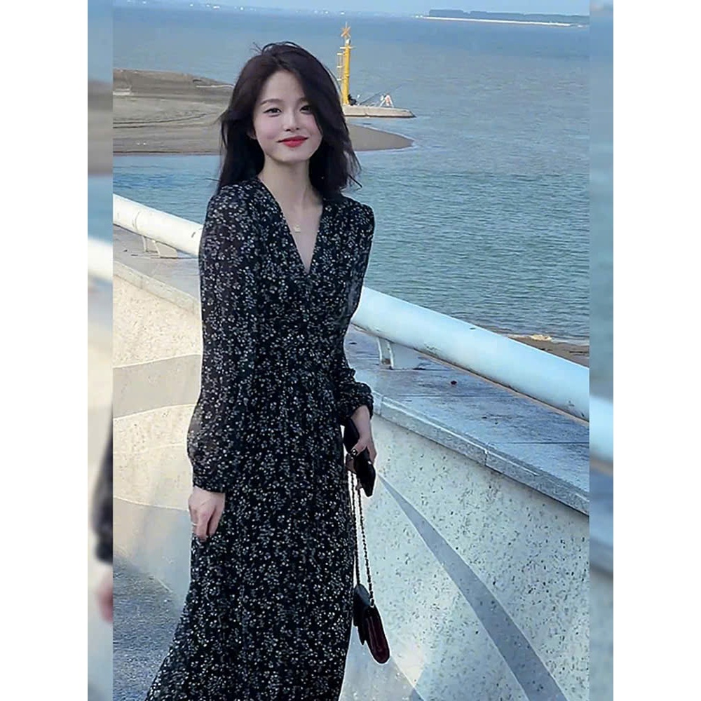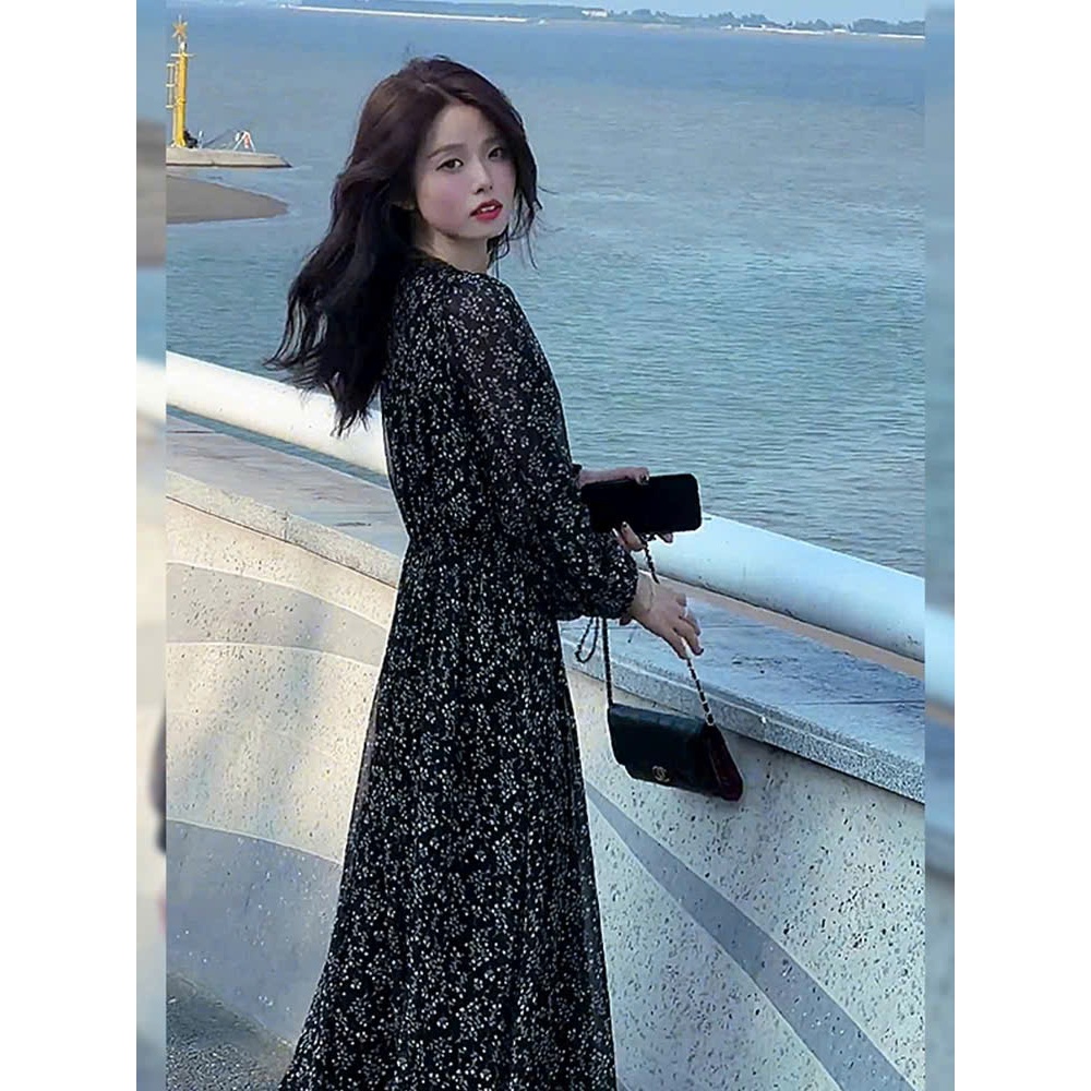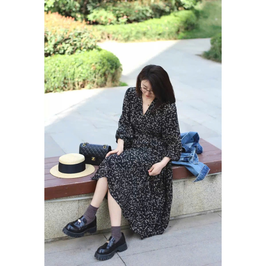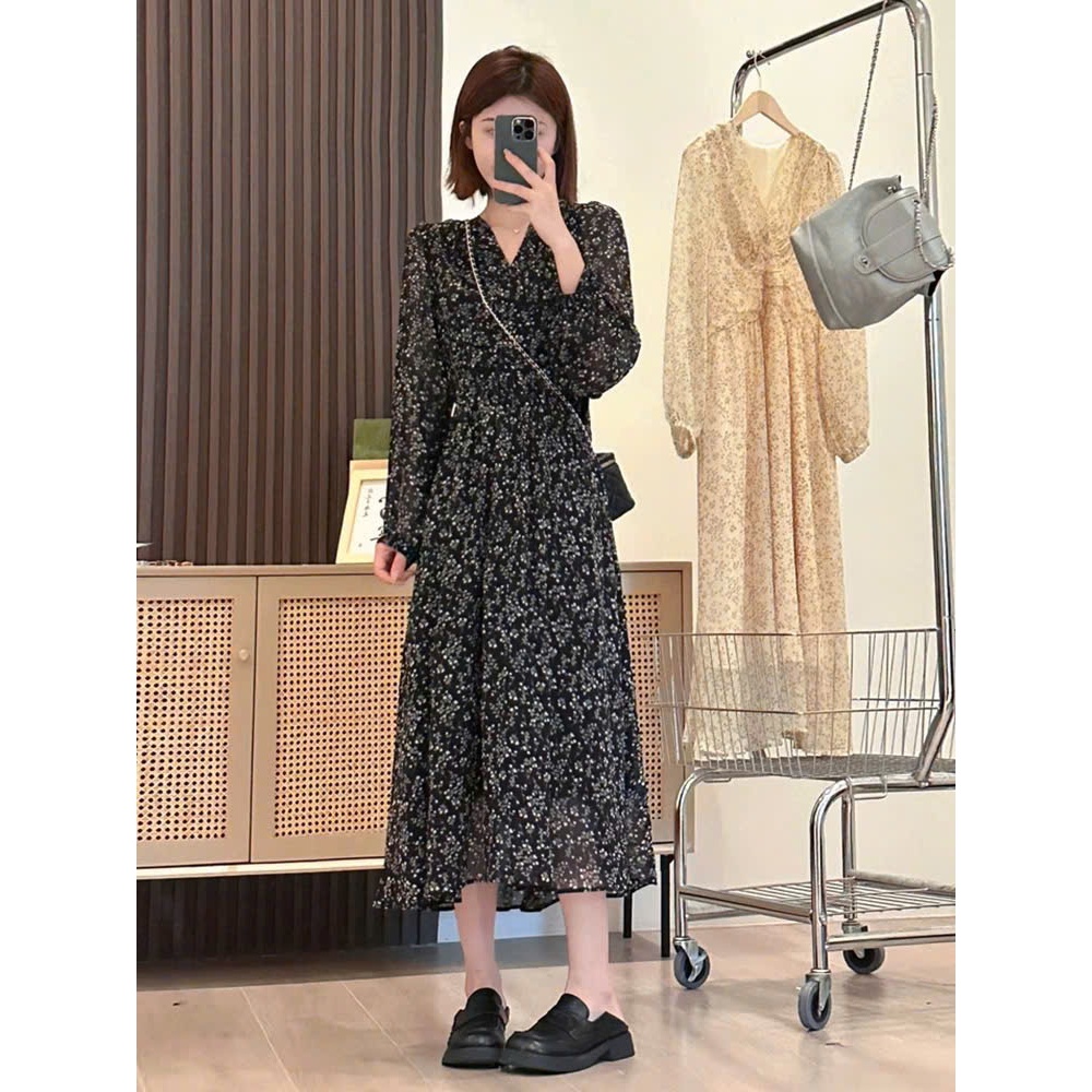 (HÀNG SẴN) Váy voan hoa nhí dài tay màu đen cổ V chun eo xòe dài MORAN phong cách Hàn Quốc nhẹ nhàng hàng QCCC (Big size