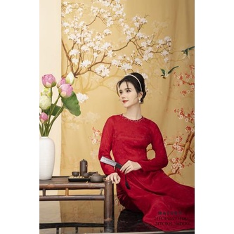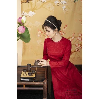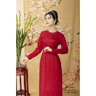 Áo Dài lụa đỏ Vải gấm Cổ tròn Đính cườm trang trí Tay dài Dài tới mắt cá chân nữ Mazano