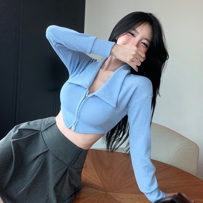 Áo Thun Croptop Tay Dài Có Khóa Kéo Màu Sắc Trơn Dành Cho Nữ