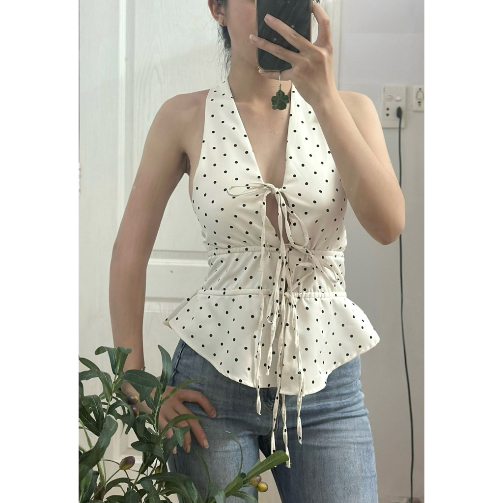 Áo chấm bi cổ yếm có múc ngực dày quyến rũ hở lưng buộc dây trước dáng xoè bèo