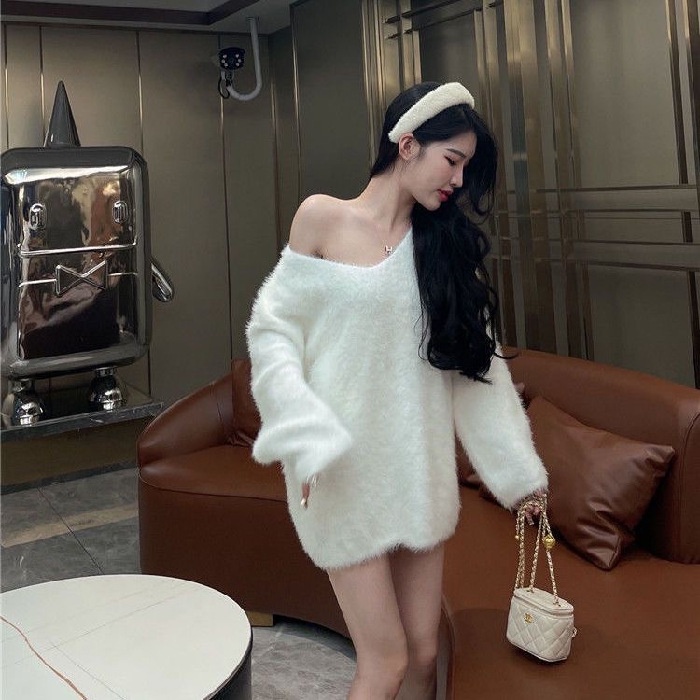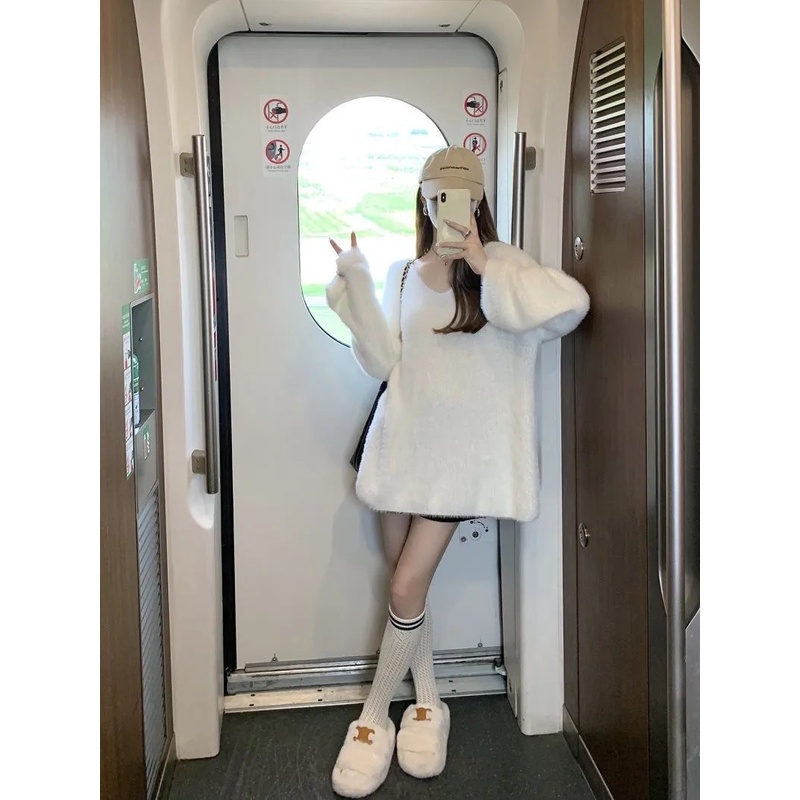 Áo dệt kim CHU MAN JIA vải nhung lông chồn mềm mại dáng rộng dài cổ chữ V thời trang thu đông cho nữ
