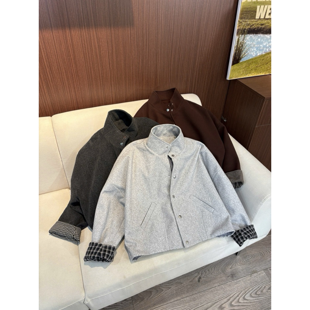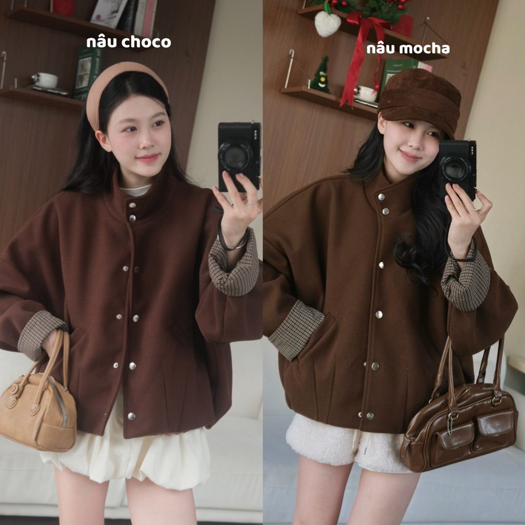 (Sẵn - Hàng chuẩn TSW) Áo khoác dạ cúc bấm cổ cao phối tay kẻ caro Nữ the.sweaterweather TSW