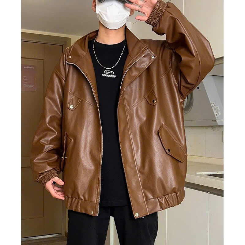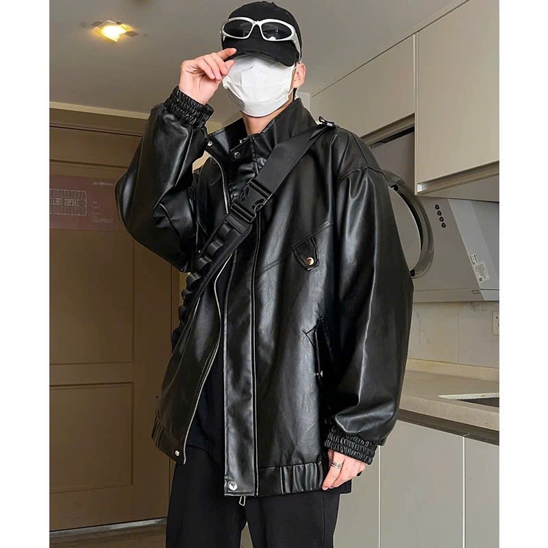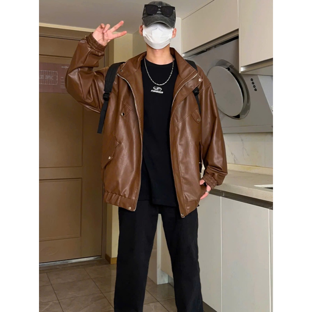 Áo khoác da nam nữ đều mặc được phối túi to chéo, áo bomber form rộng bo chun tay, gấu áo