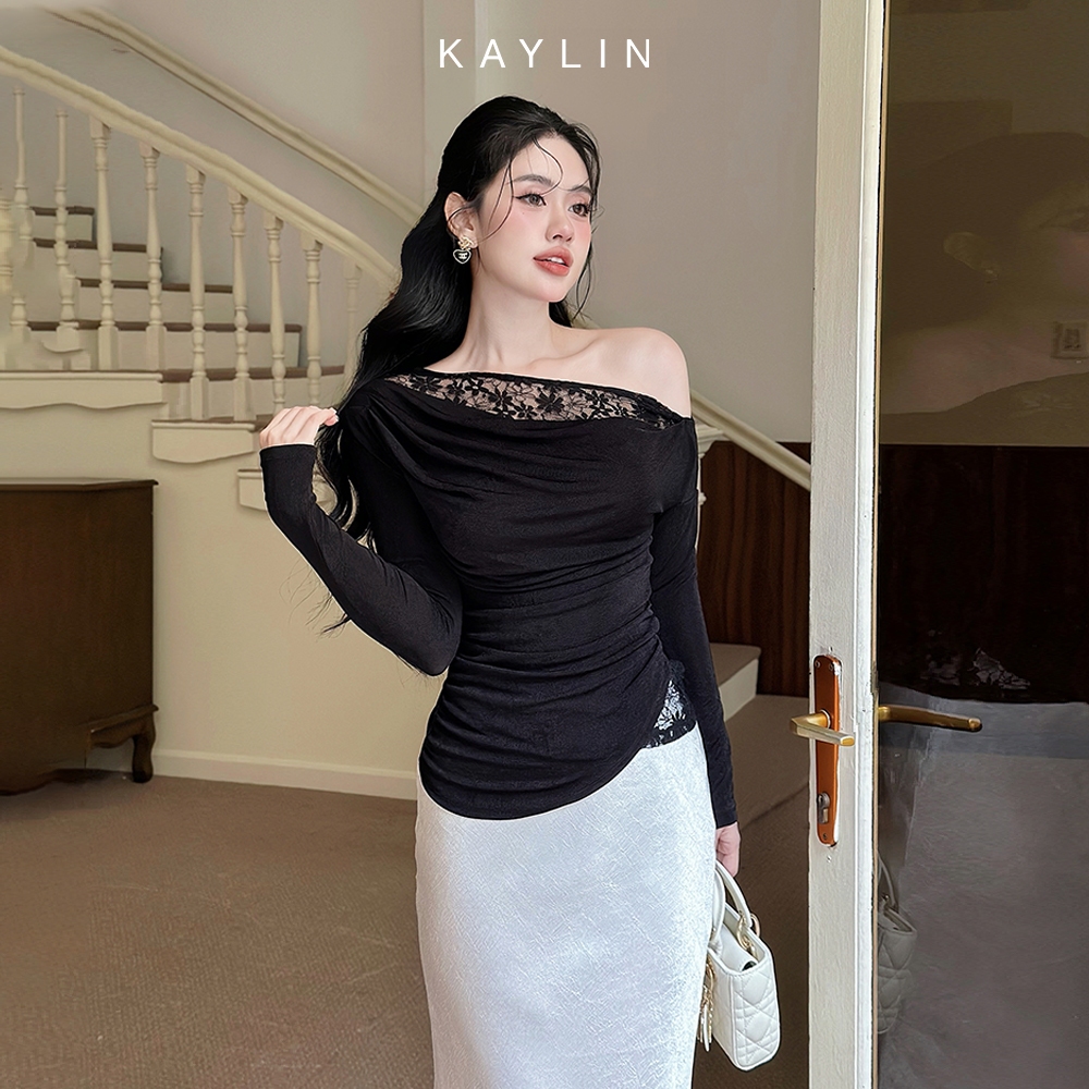 Áo kiểu KAYLIN tay dài lệch vai phối ren chất vải lụa thun mỏng nhẹ phong cách gợi cảm - N2363