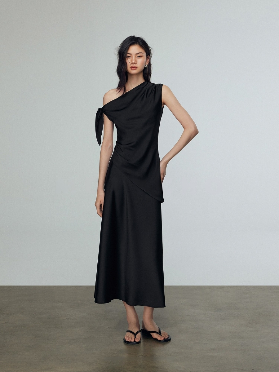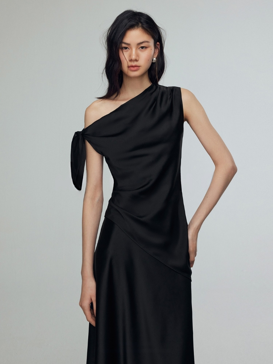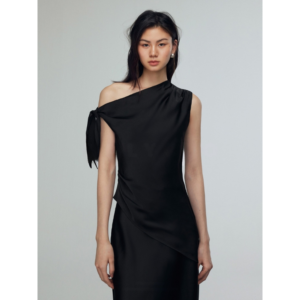 Áo lụa Tô châu, áo kiểu lệch vai cách điệu vạt chéo bất đối xứng thiết kế buộc nơ đủ size SML