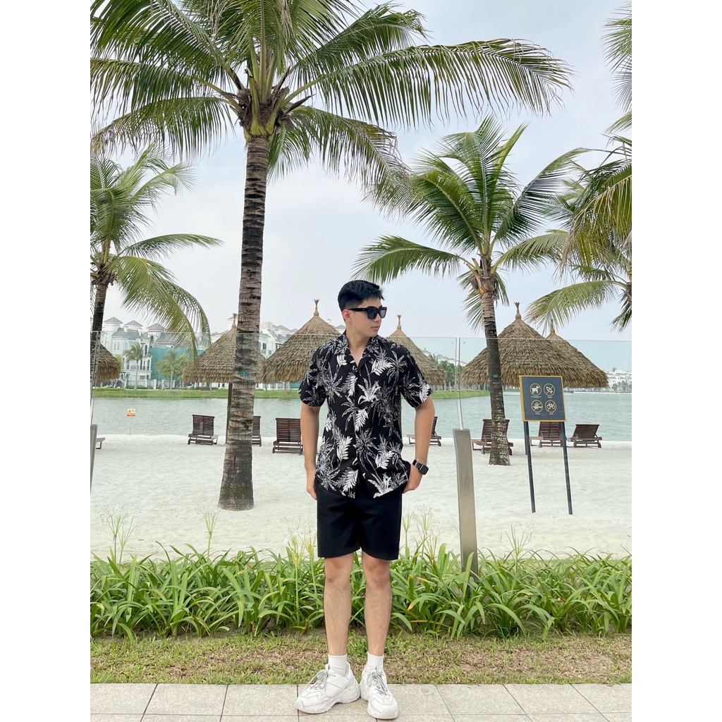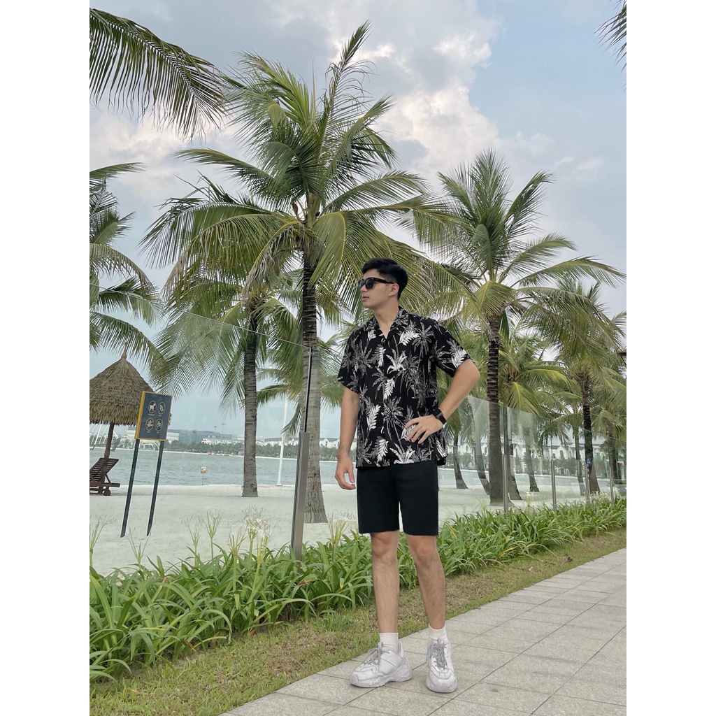Áo sơ mi Cuban LeeZone form rộng, chất vải lụa thoáng mát |Sơ mi hoạ tiết Cây Dừa Đen
