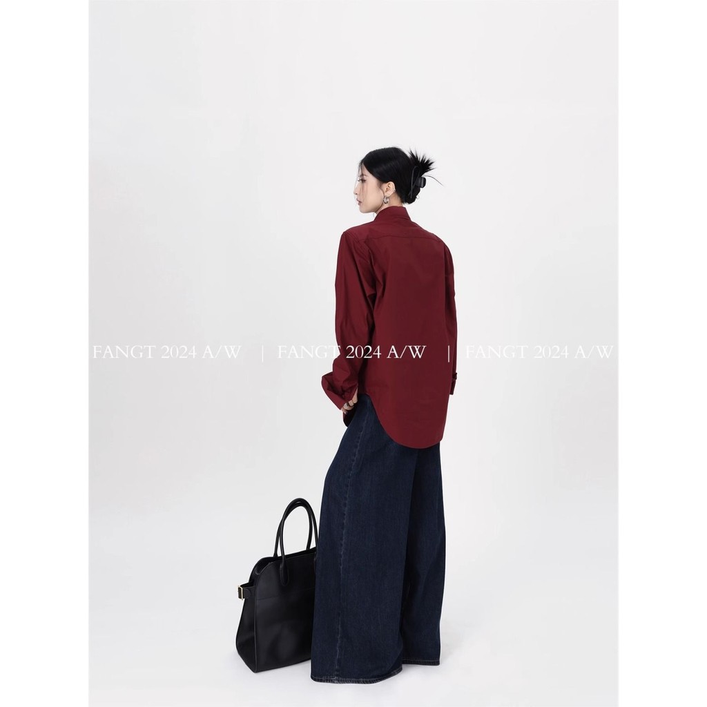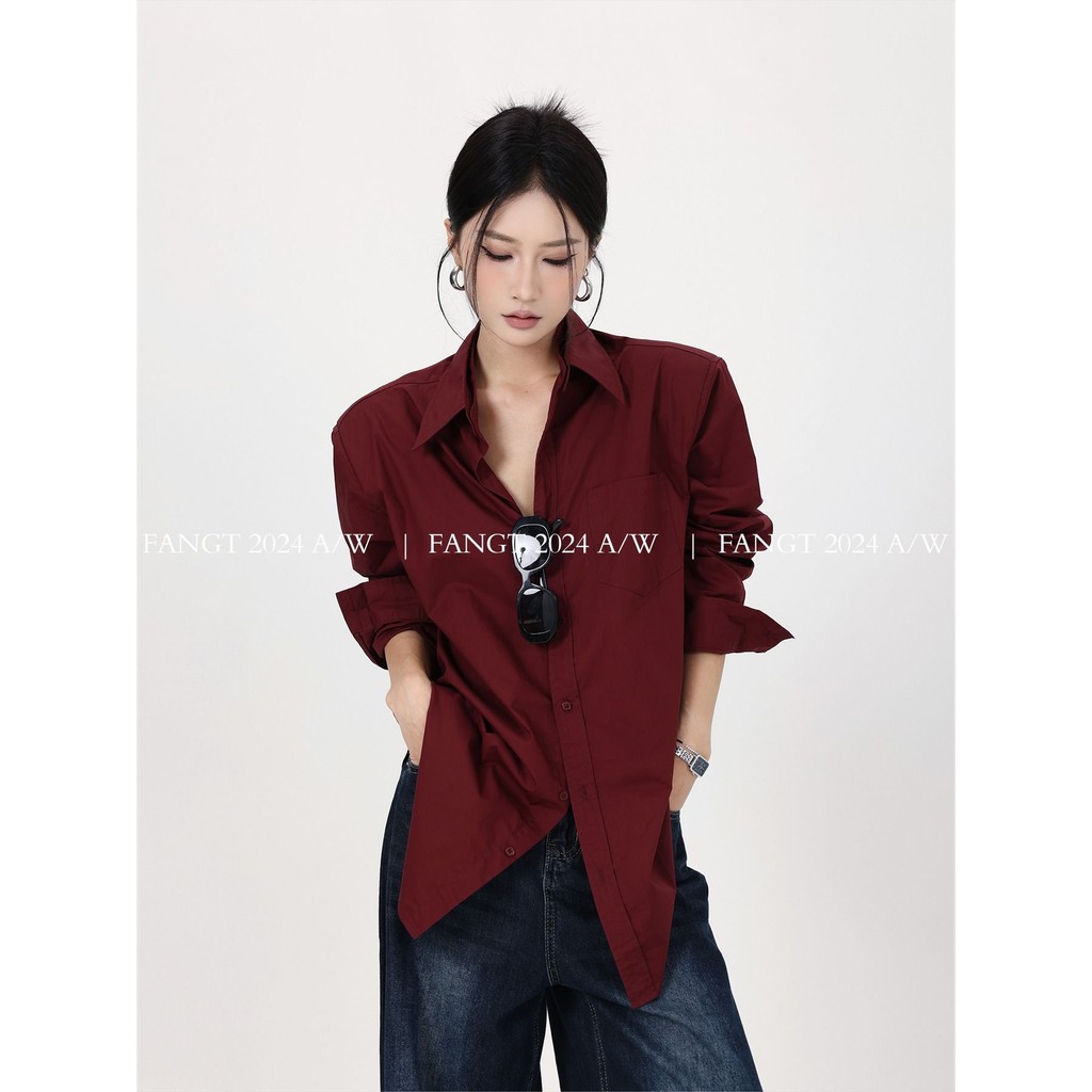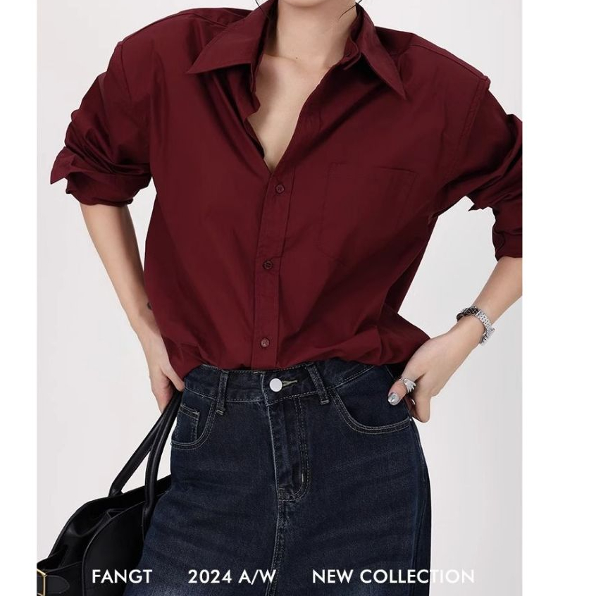 Áo sơ mi dài tay nữ màu burgundy retro, phong cách mới cho xuân thu