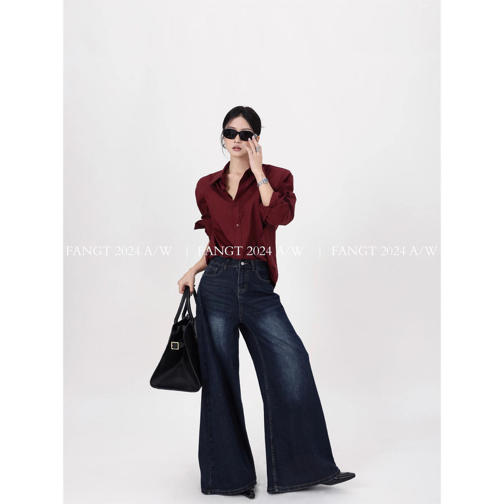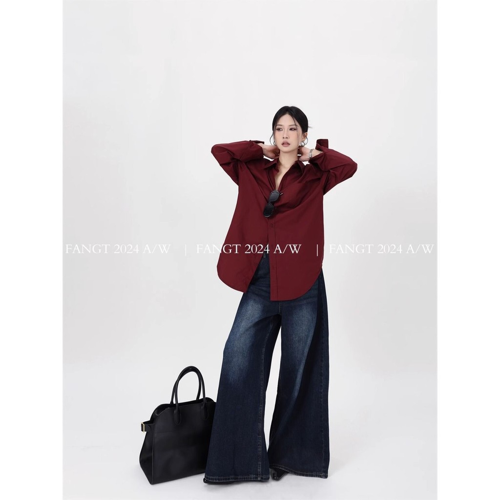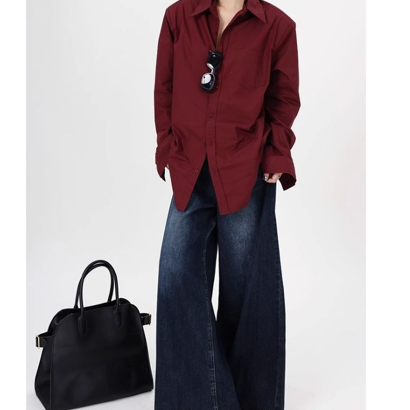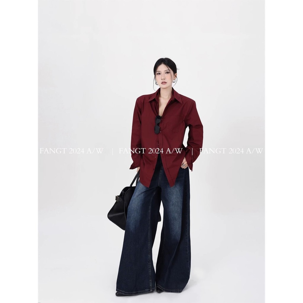Áo sơ mi dài tay nữ màu burgundy retro, phong cách mới cho xuân thu