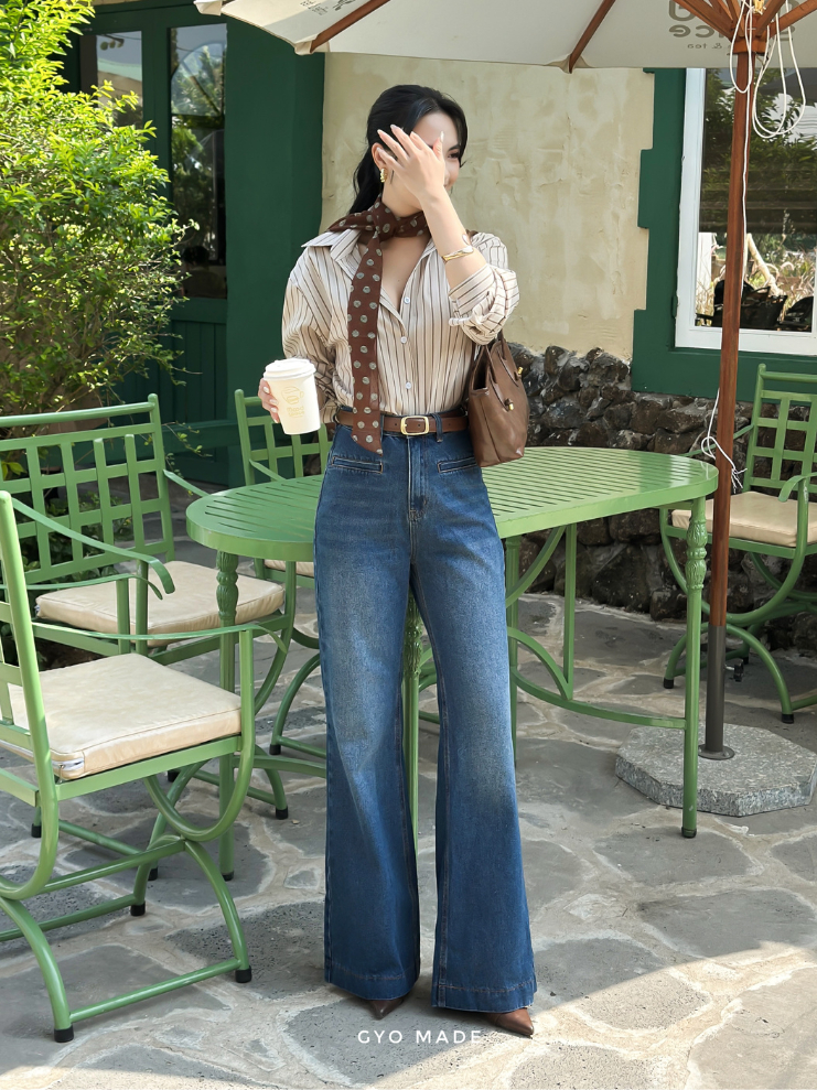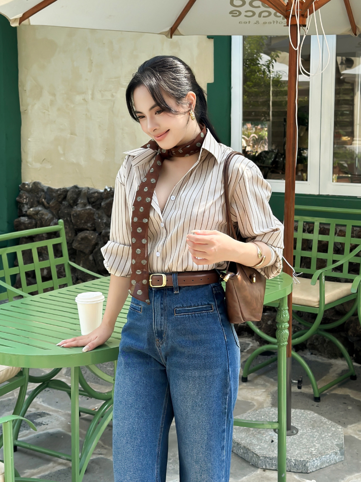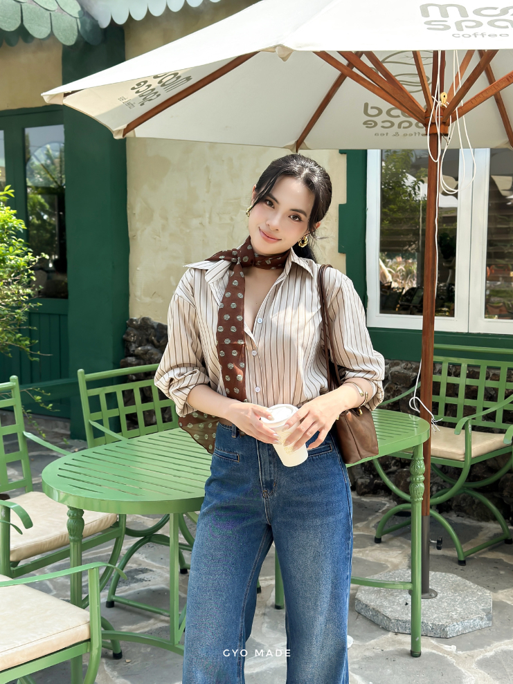 Áo sơ mi nữ tay dài sọc nâu GYOMADE® chất cotton pha cao cấp ít nhăn thanh lịch, thoải mái | GA099