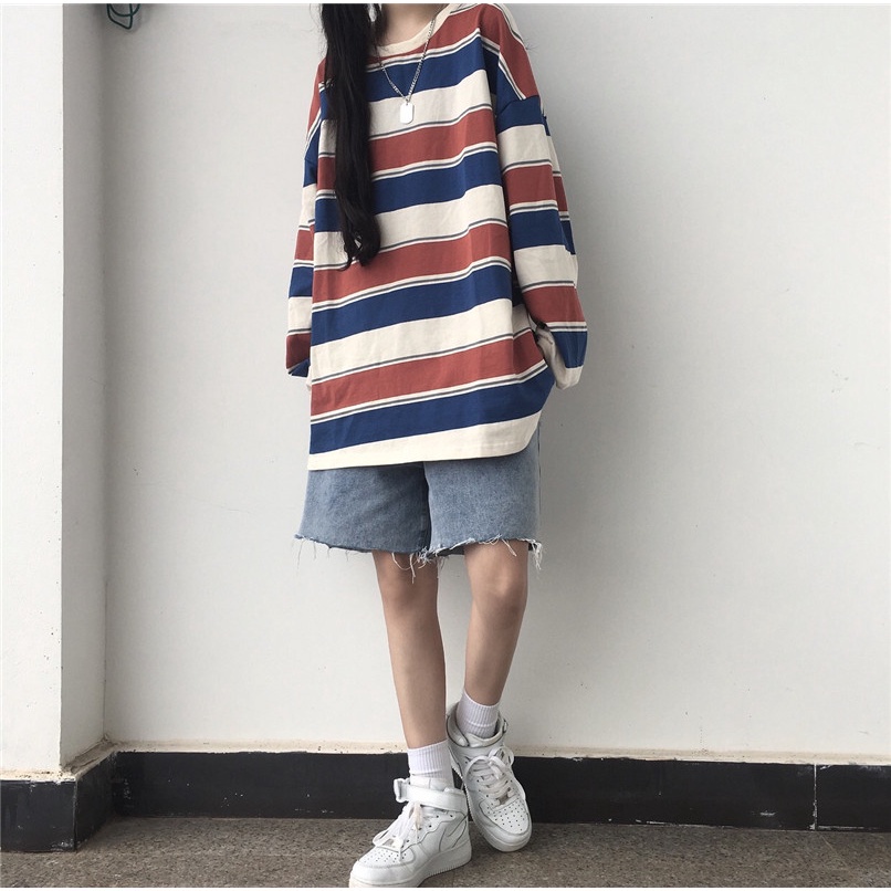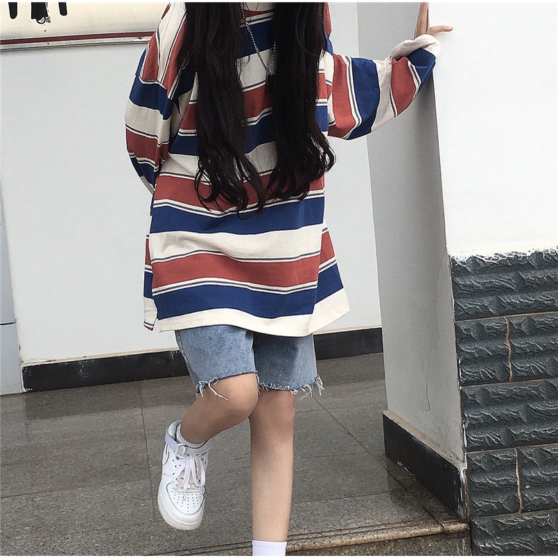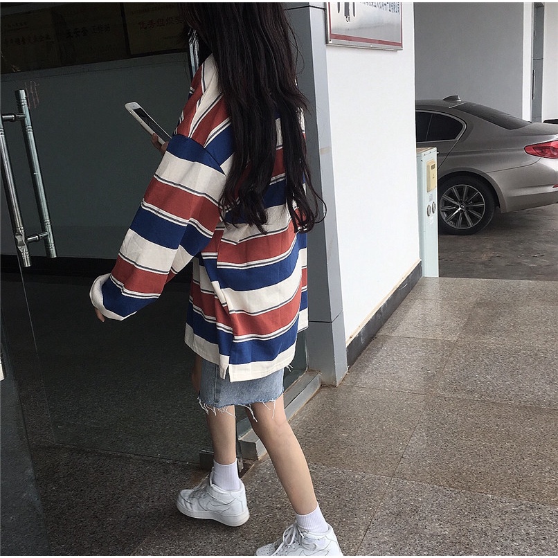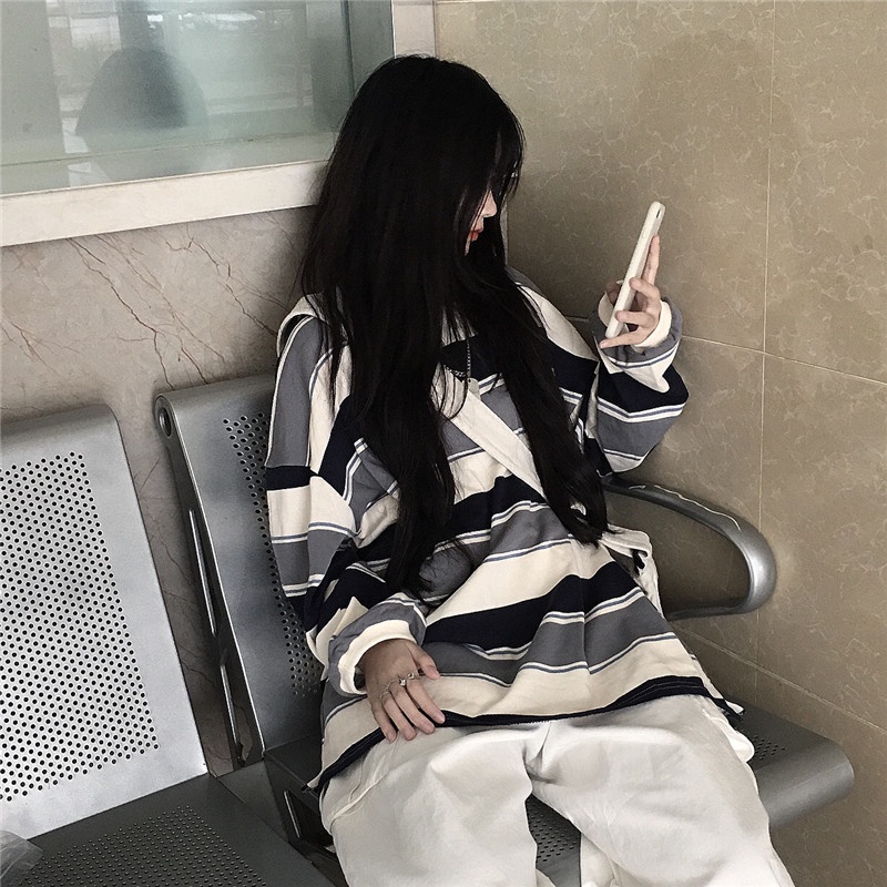 Áo sweatshirt nữ SUXI tay dài cổ tròn dáng rộng kẻ sọc trẻ trung thời trang mùa thu Hàn Quốc