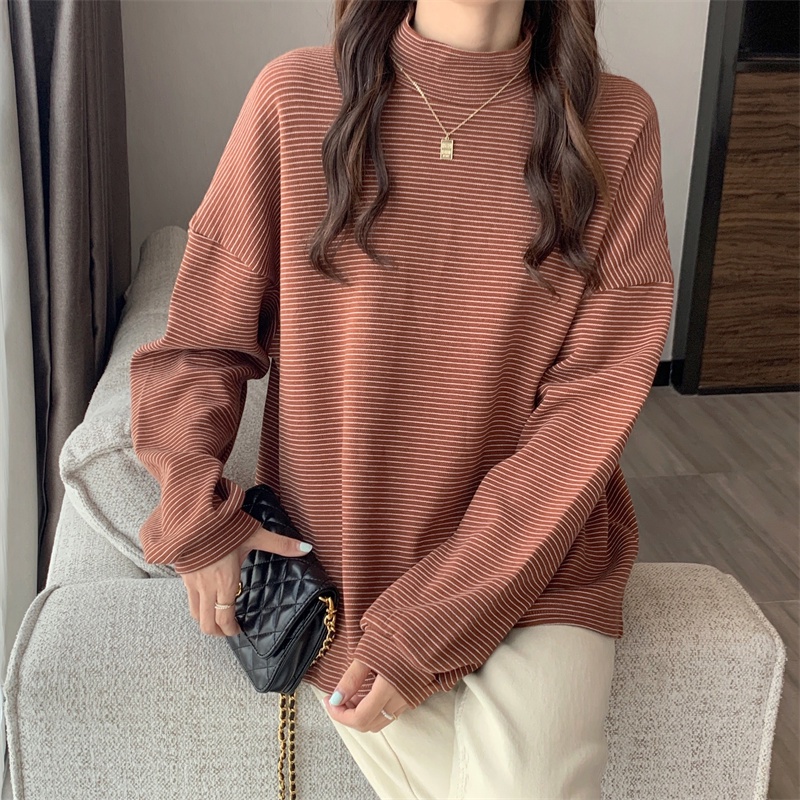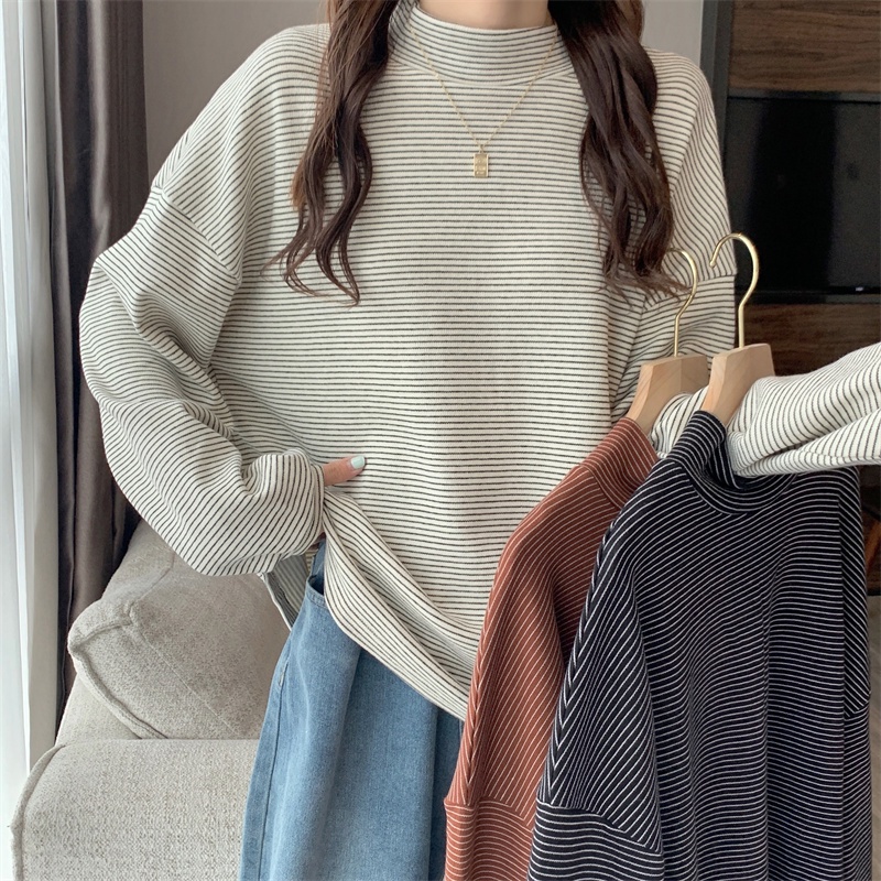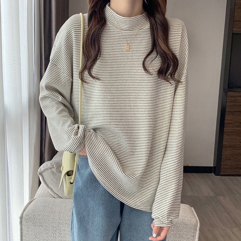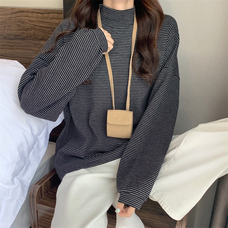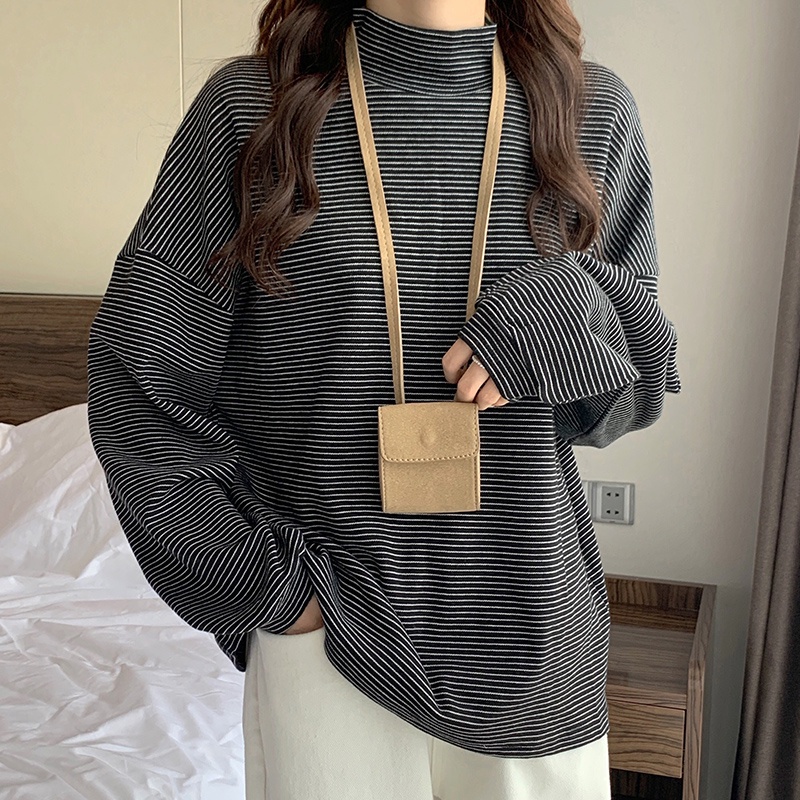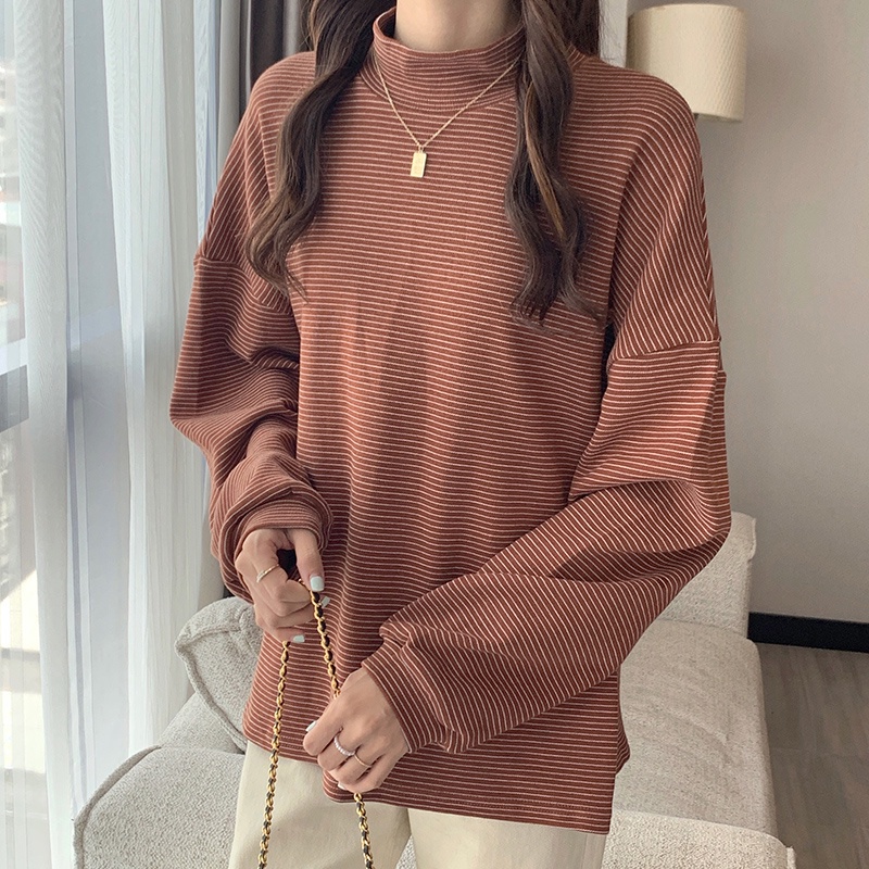 Áo thun SUXI cổ cao dáng rộng vải dày họa tiết kẻ sọc phong cách Hàn Quốc thời trang mùa thu cho nữ