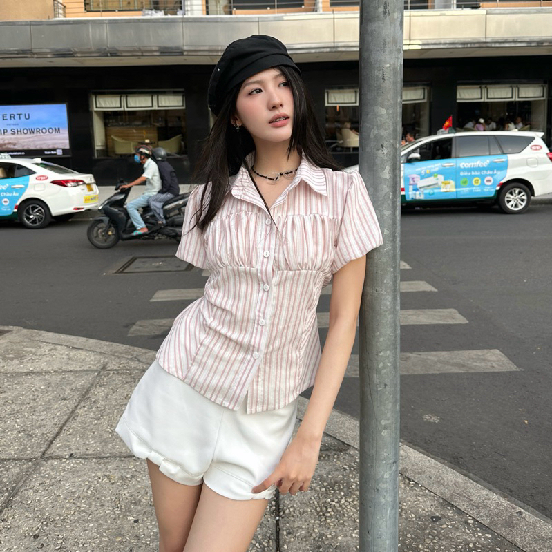 Áo Sơ Mi Kiểu Tay Phồng Chiết Eo Mùa Hè Chất Liệu Xô Nhật - Minipie