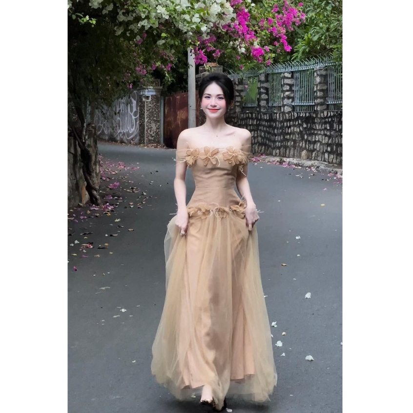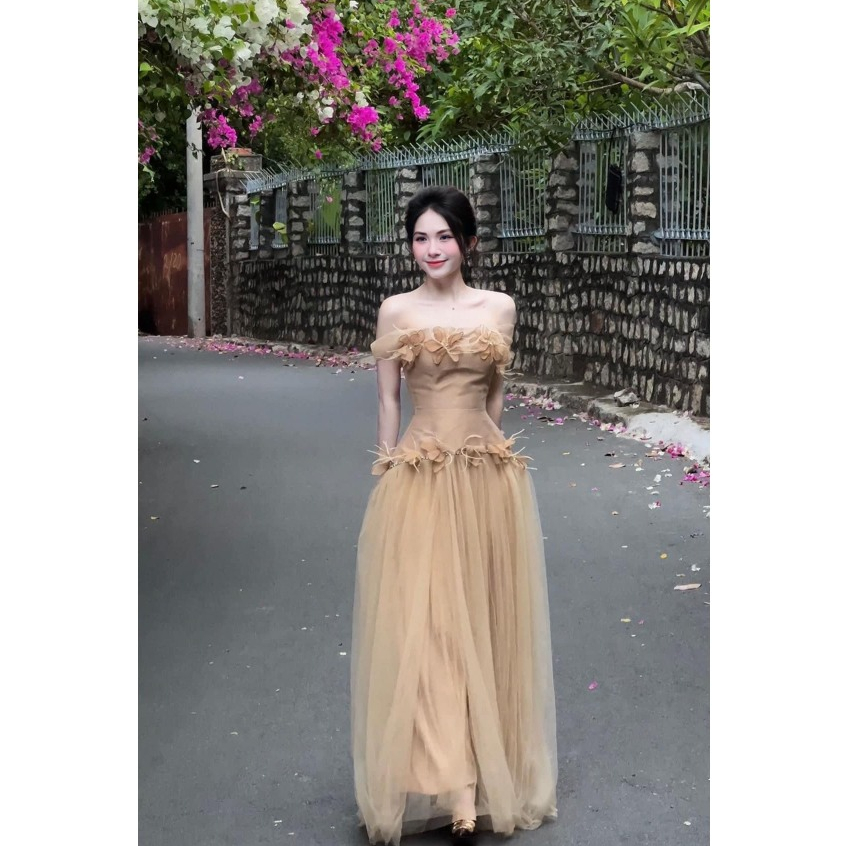 Đầm Dress Váy Thiết Kế Dự Tiệc Tafta Trễ Vai Cúp Ngực Hoa Đá Phối Váy Lưới Maxi Xòe Tone Màu Nude Sang Trọng SP010177