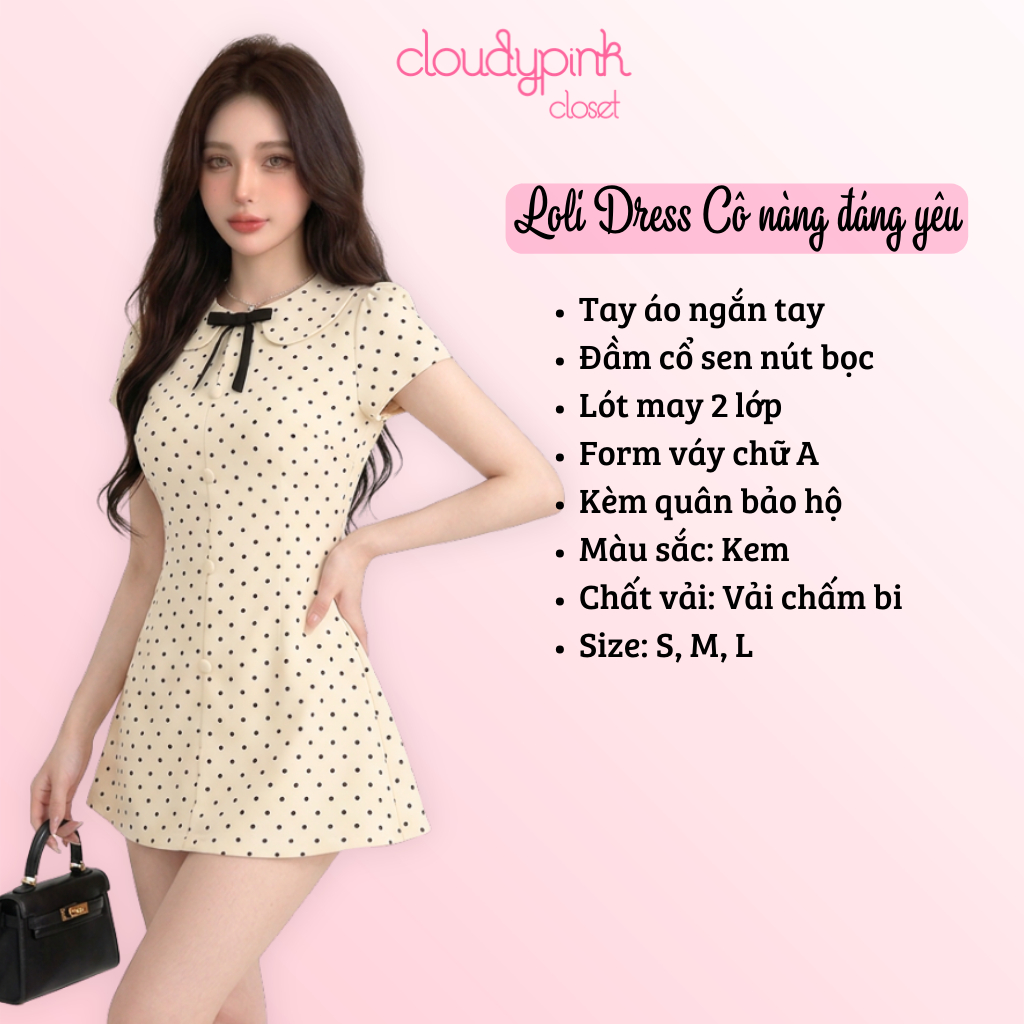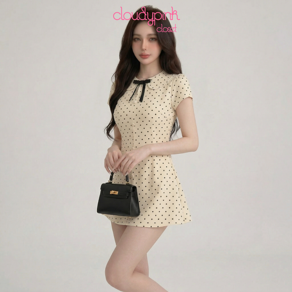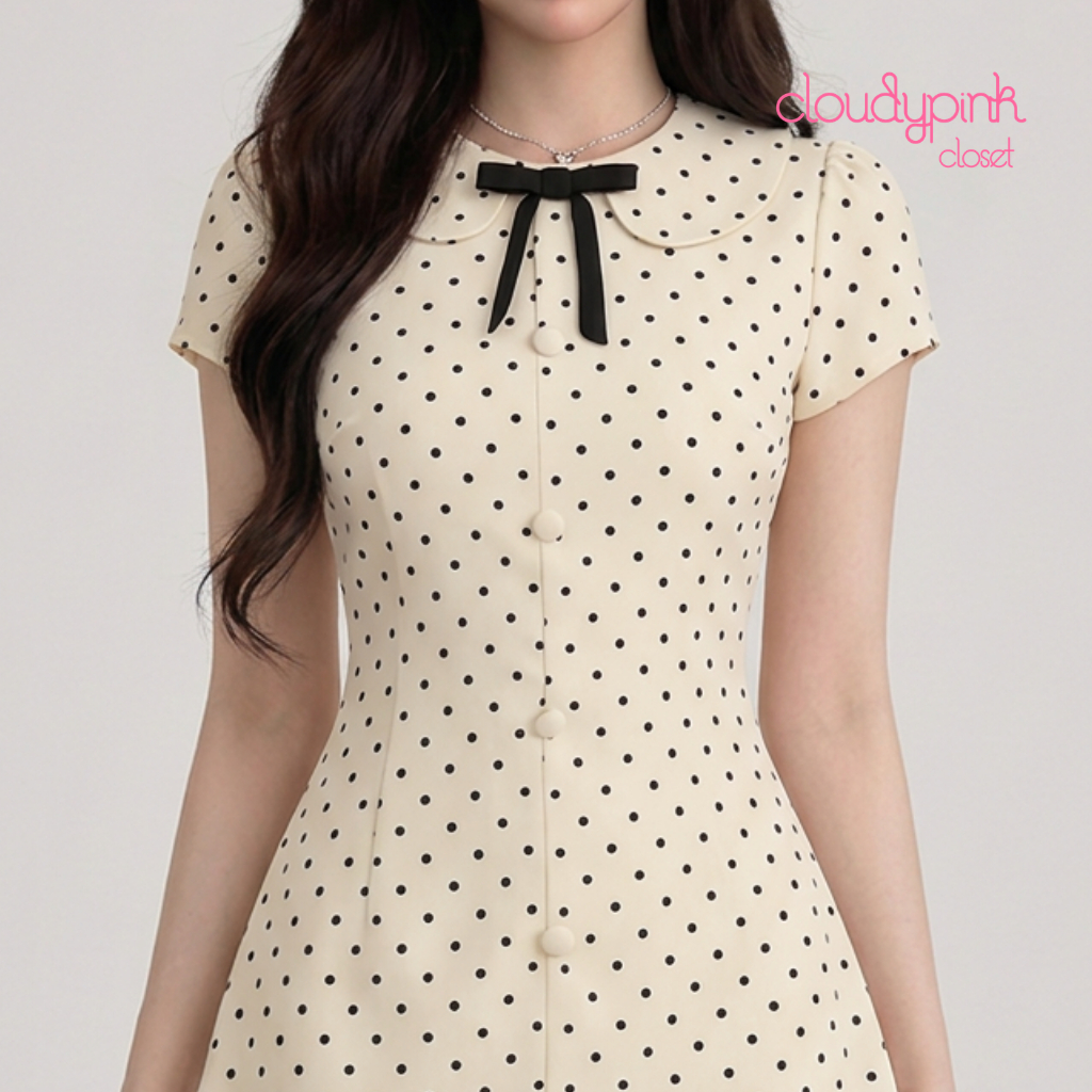 Đầm chấm bi cổ sen nơ đen dáng ôm chữ A Cloudy Pink Váy ngắn vintage phong cách Hàn Quốc V04