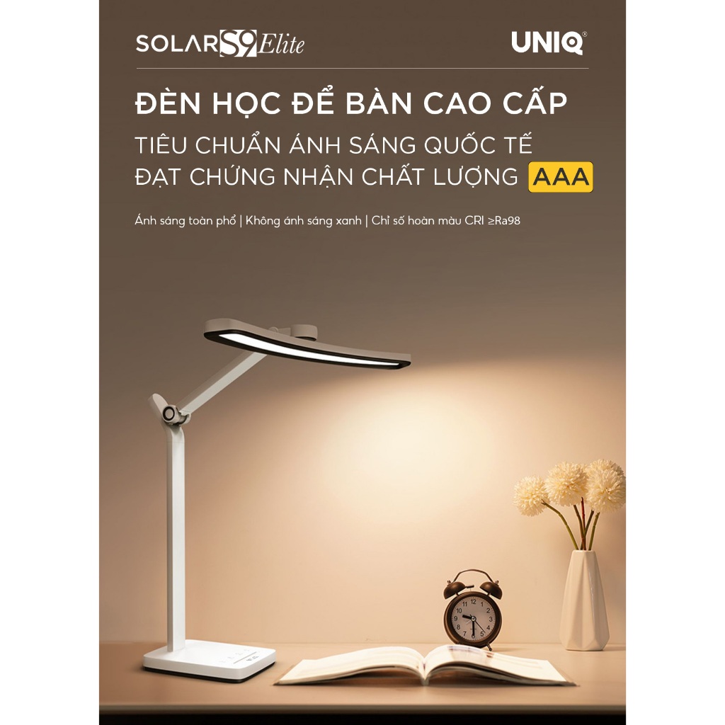 Đèn led để bàn làm việc cao cấp UNIQ Solar S9 Elite đèn học đ ọc sách chống cận thị cho bé tích hợp đồng hồ podomoro
