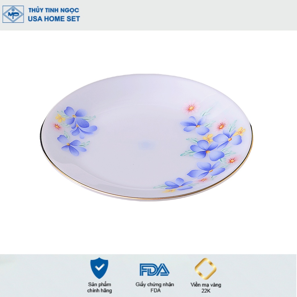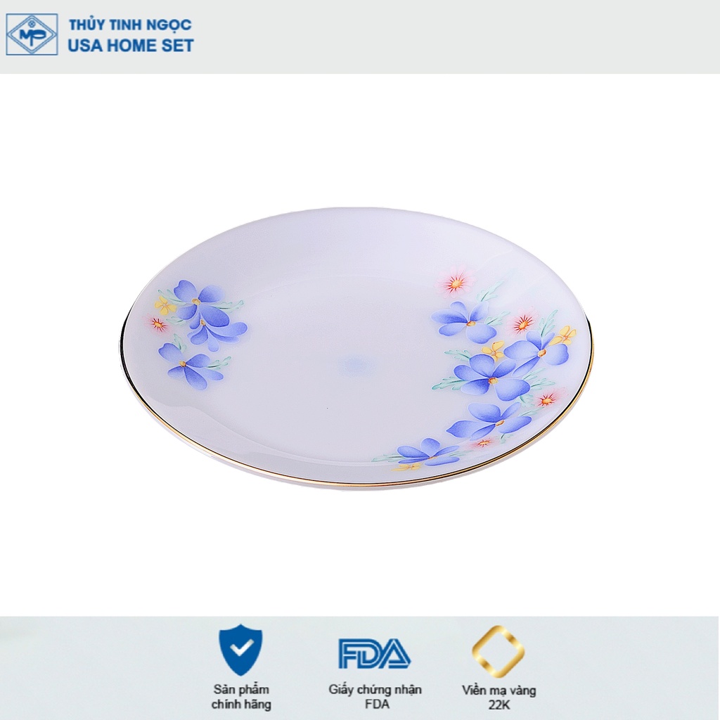 Đĩa tròn nông viền vàng 22K họa tiết hoa màu xanh Thủy Tinh Ngọc USA Homeset cao cấp nhập khẩu chính hãng