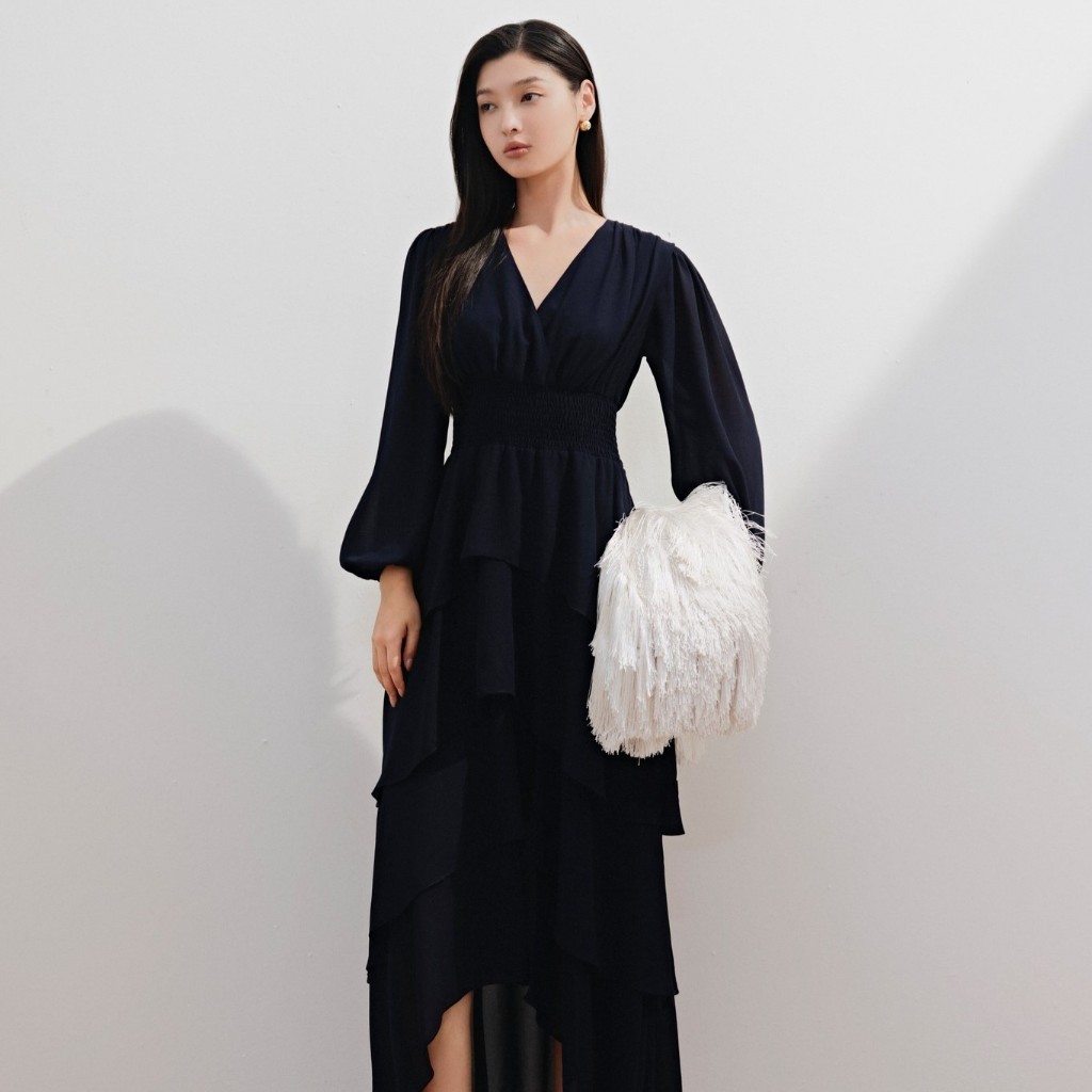 Đầm maxi tay dài cổ V thiết kế tầng bèo sang trọng Sharni phù hợp đi tiệc đi biển OLV