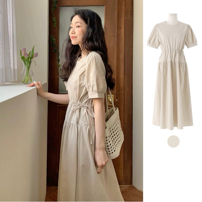 Đầm midi rút eo cổ tròn dáng xoè phong cách Hàn Quốc