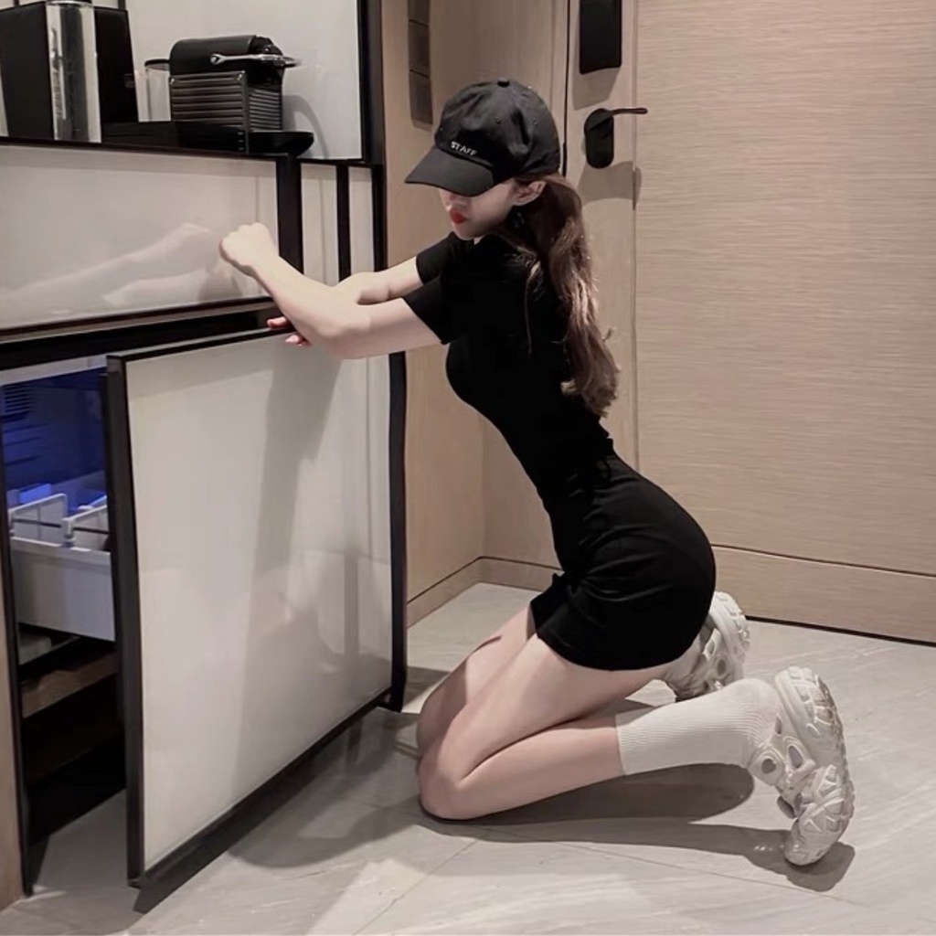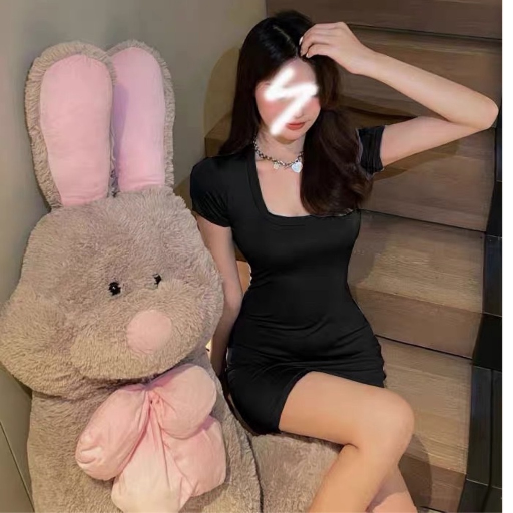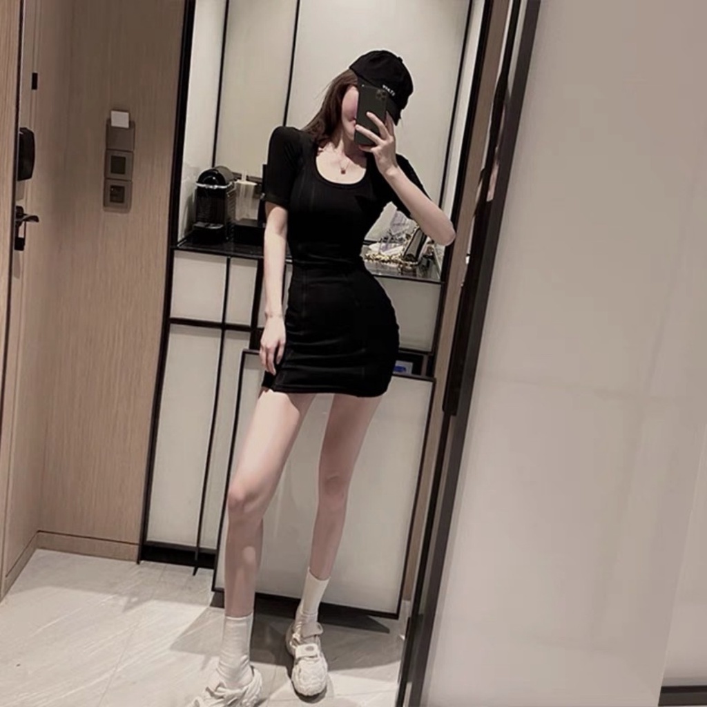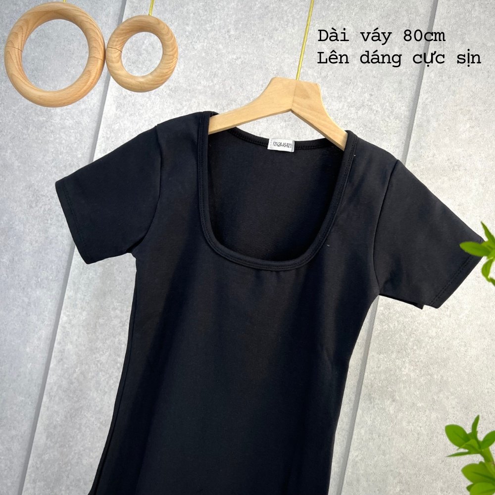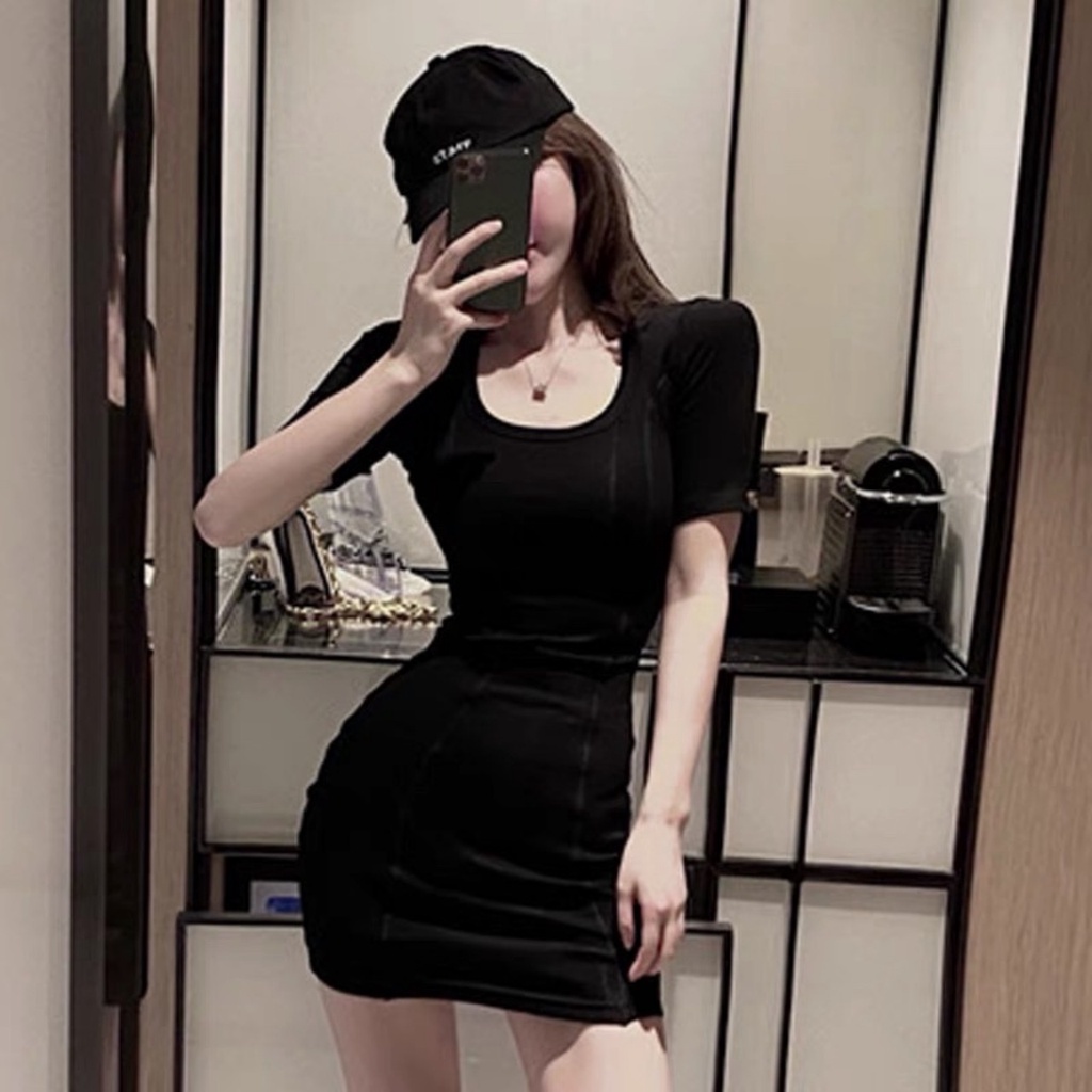 Đầm nữ ngắn tay body cổ U - Váy body dáng ngắn phong cách Hàn Quốc
