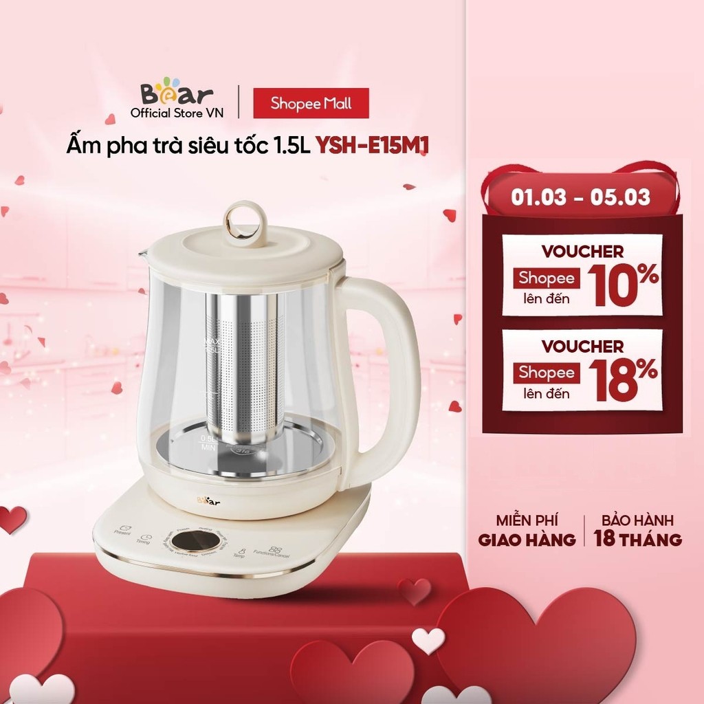 Ấm Đun Pha Trà 1.5L Siêu Tốc Bear YSH-E15M1 - Hàng Chính Hãng