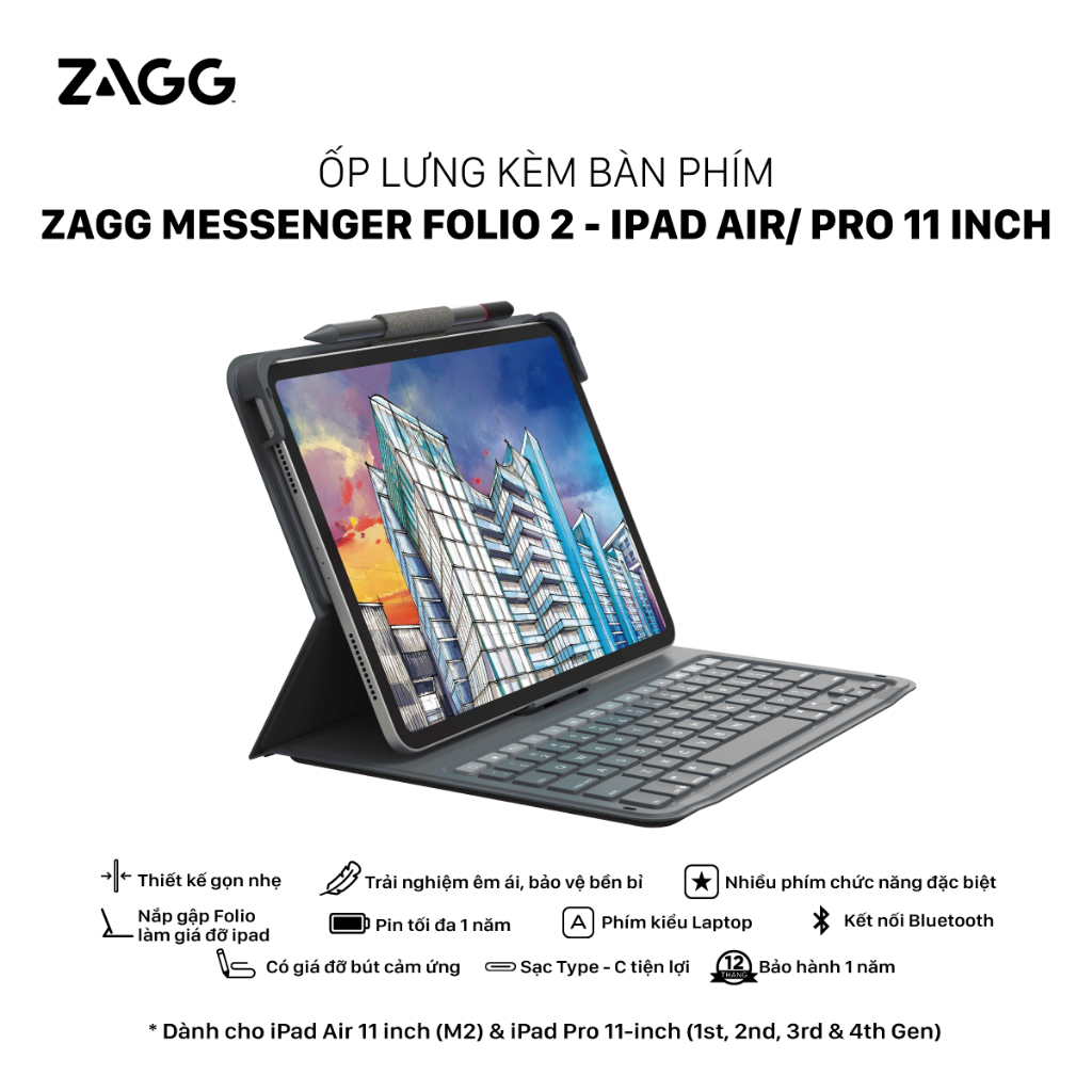 Ốp lưng kèm bàn phím ZAGG Messenger Folio 2 iPad 10.2/10.5/iPad gen 9/ iPad Air 6 M2/ Pro 11 inch