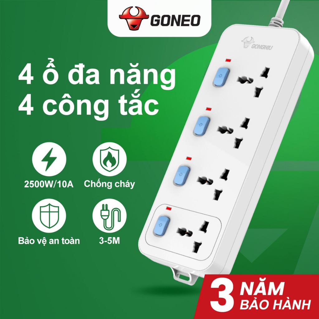 Ổ Cắm Điện Chống Cháy GONEO - 4 Ổ Đa Năng 4 Công Tắc - N3040 - Công Suất 10A/250/2500W
