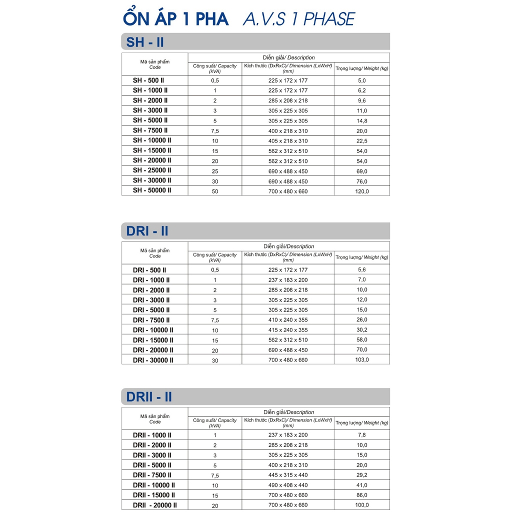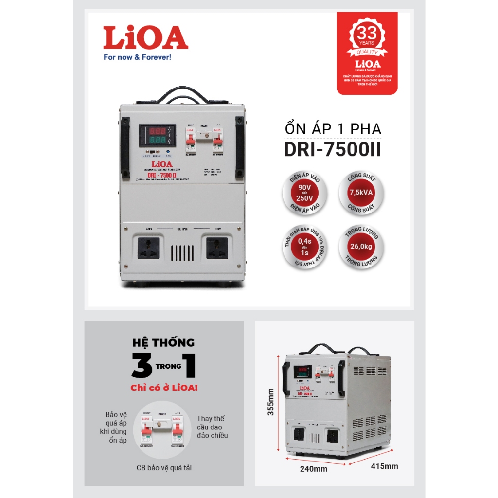 Ổn Áp LiOA 1 Pha DRI-7500II 7,5kVA 7500VA. Điện Áp Vào 90V÷250V, Điện Áp Ra 220V÷110V. Dây Đồng 100%. Bảo Hành 36 Tháng