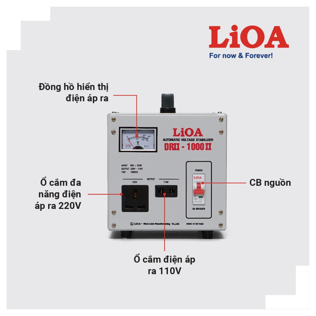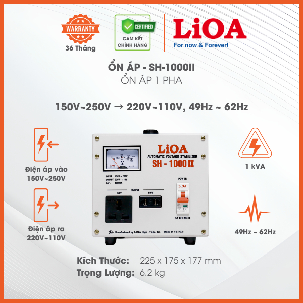 Ổn Áp LiOA 1 Pha mã SH-1000II 1kVA 1000VA. Điện Áp Vào 150V÷250V, Điện Áp Ra 220V÷110V. Dây Đồng 100%. Bảo Hành 36 Tháng