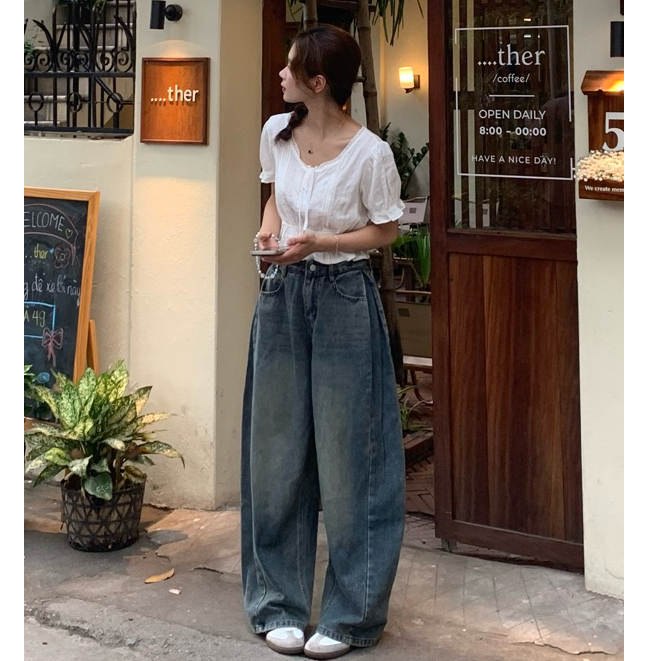 𝐌𝐈𝐍𝐈 𝐇𝐎𝐔𝐒𝐄 - Quần jeans nữ ống rộng phối line nhúm phần hông tôn dáng che khuyết điểm MINI003