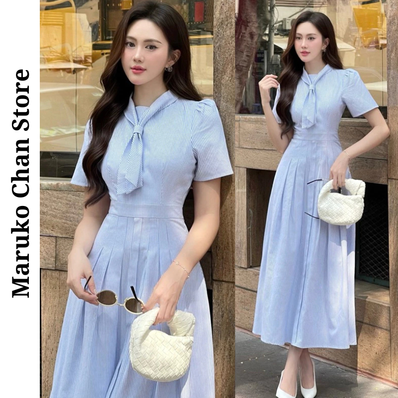 Đầm sơ mi kẻ VSM28 váy dáng dài sọc công sở thanh lịch thiết kế đi chơi đi làm đi biển cổ nơ tiểu thư