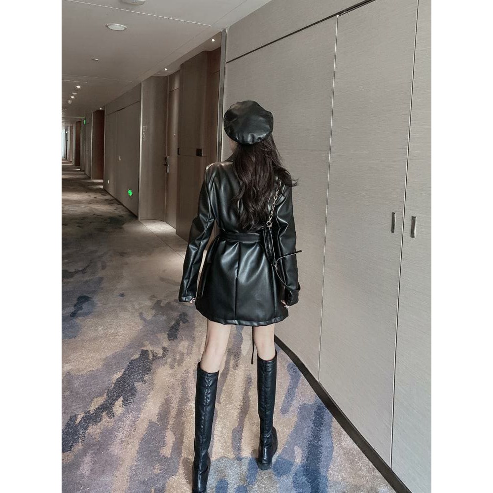 (Sẵn) Áo khoác vest da nữ thu đông dáng dài kèm thắt lưng sành điệu