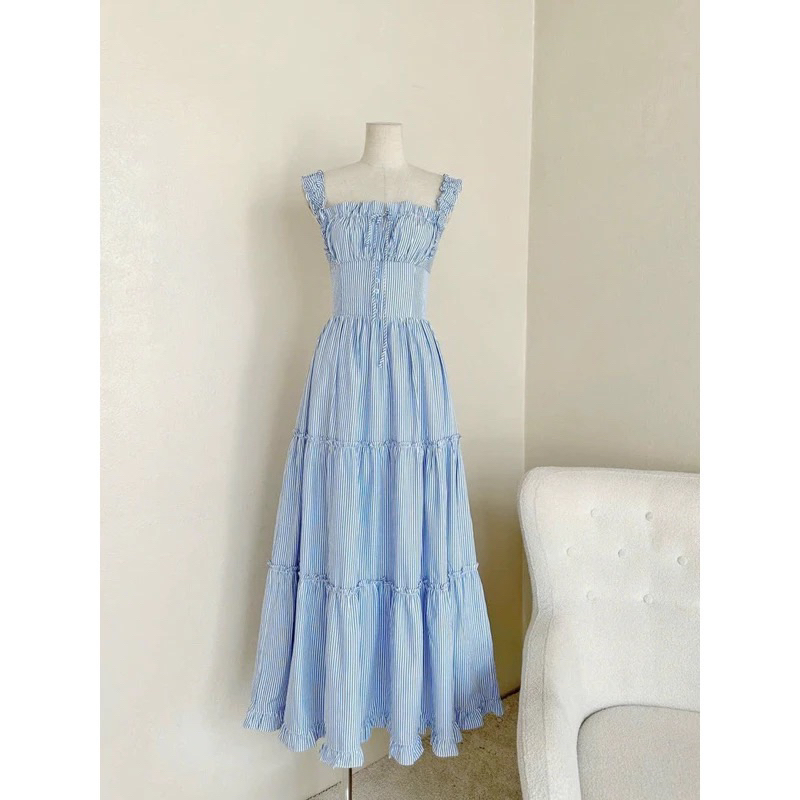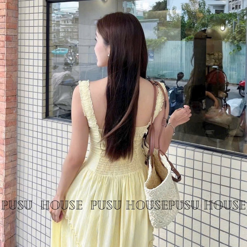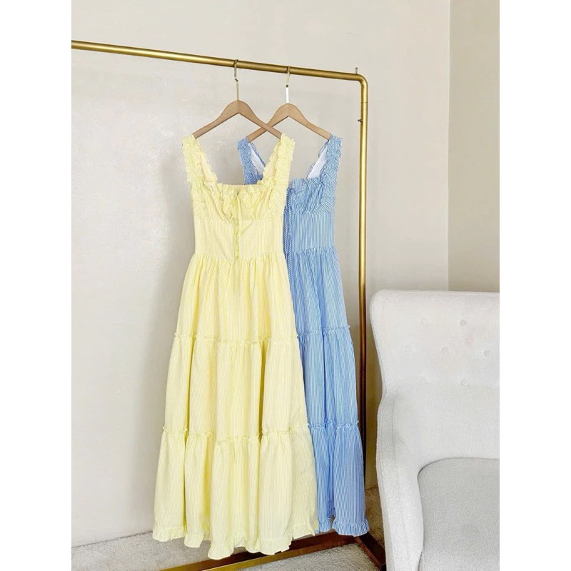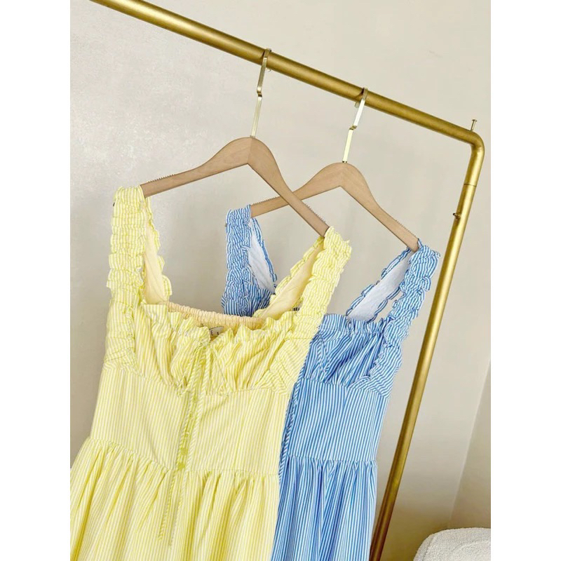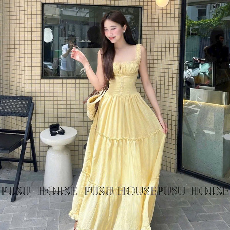 [ Hàng sẵn ]Đầm maxi sọc vàng /xanh 2S phối bèo tiểu thư , Váy maxi đi biển đi chơi dạo phố tôn dáng xinh - pusu