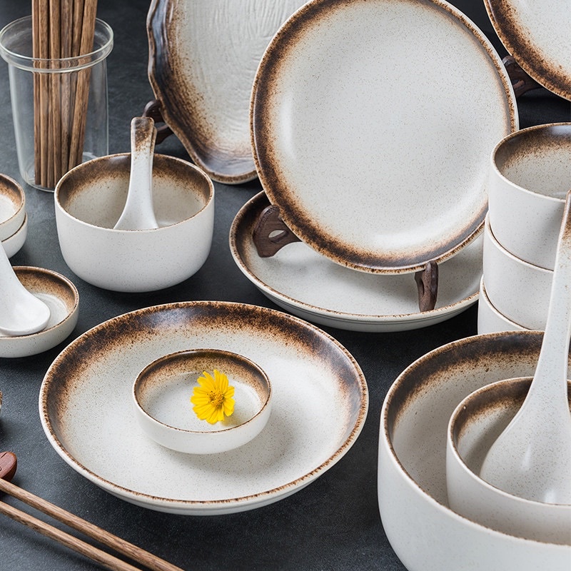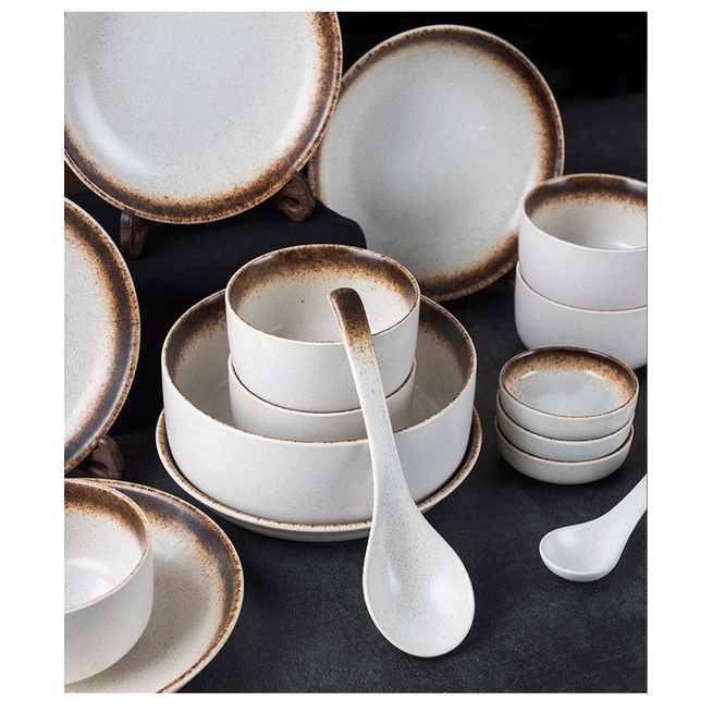 [LẺ] Bộ bát đĩa đẹp trắng viền nâu, bát đĩa decor, bát đĩa trắng