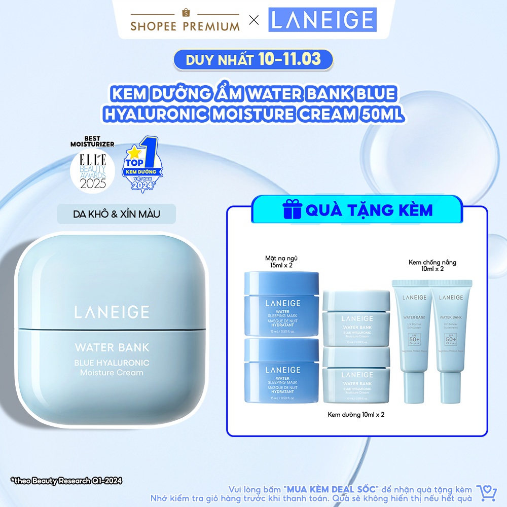 Kem Dưỡng Ẩm Sâu 100H Laneige Water Bank Blue Hyaluronic Moisture Cream 50ml (Da Thường và Da Khô)