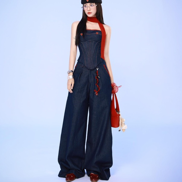[ Sẵn & ảnh thật] SET JEAN DENIM VIỀN REN NÚT TIM (ko kèm phụ kiện)