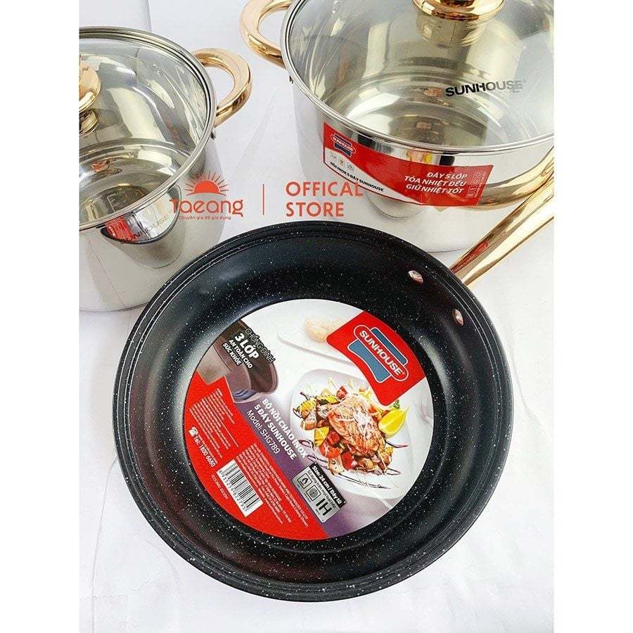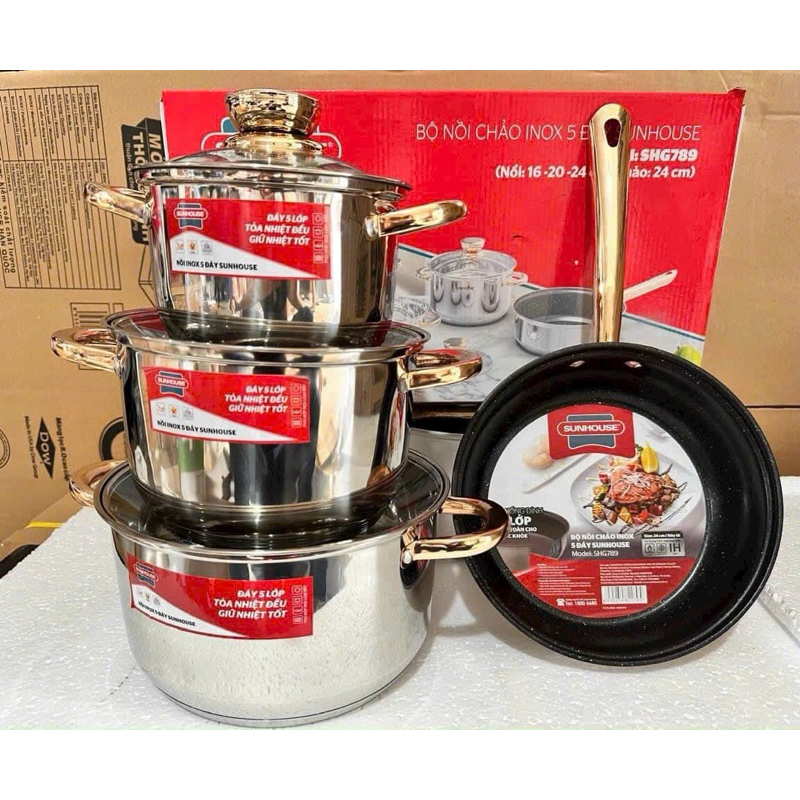 Bộ nồi chảo inox 5 đáy Sunhouse SHG789 hàng chính hãng CÓ TÁCH LẺ 3 NỒI, HOẶC 3 NỒI 1 CHẢO