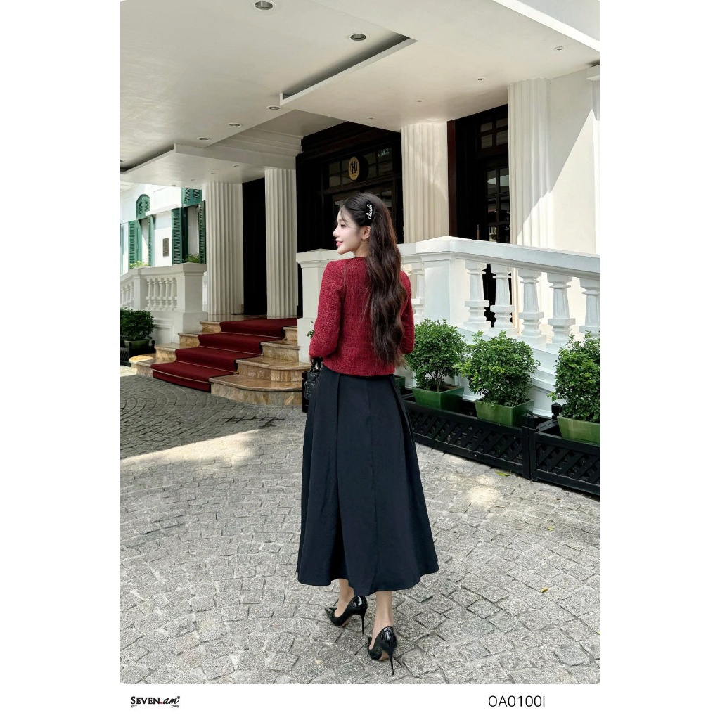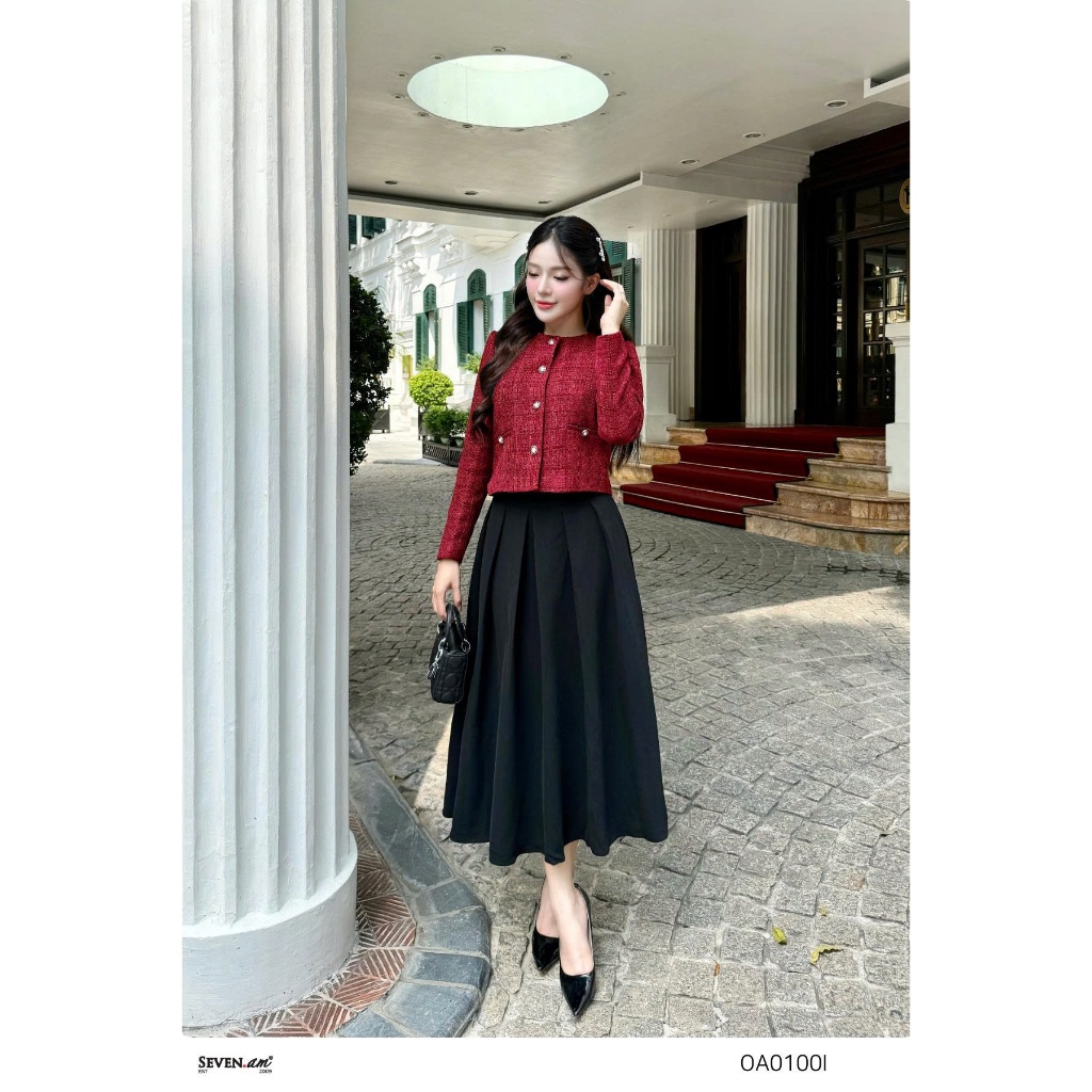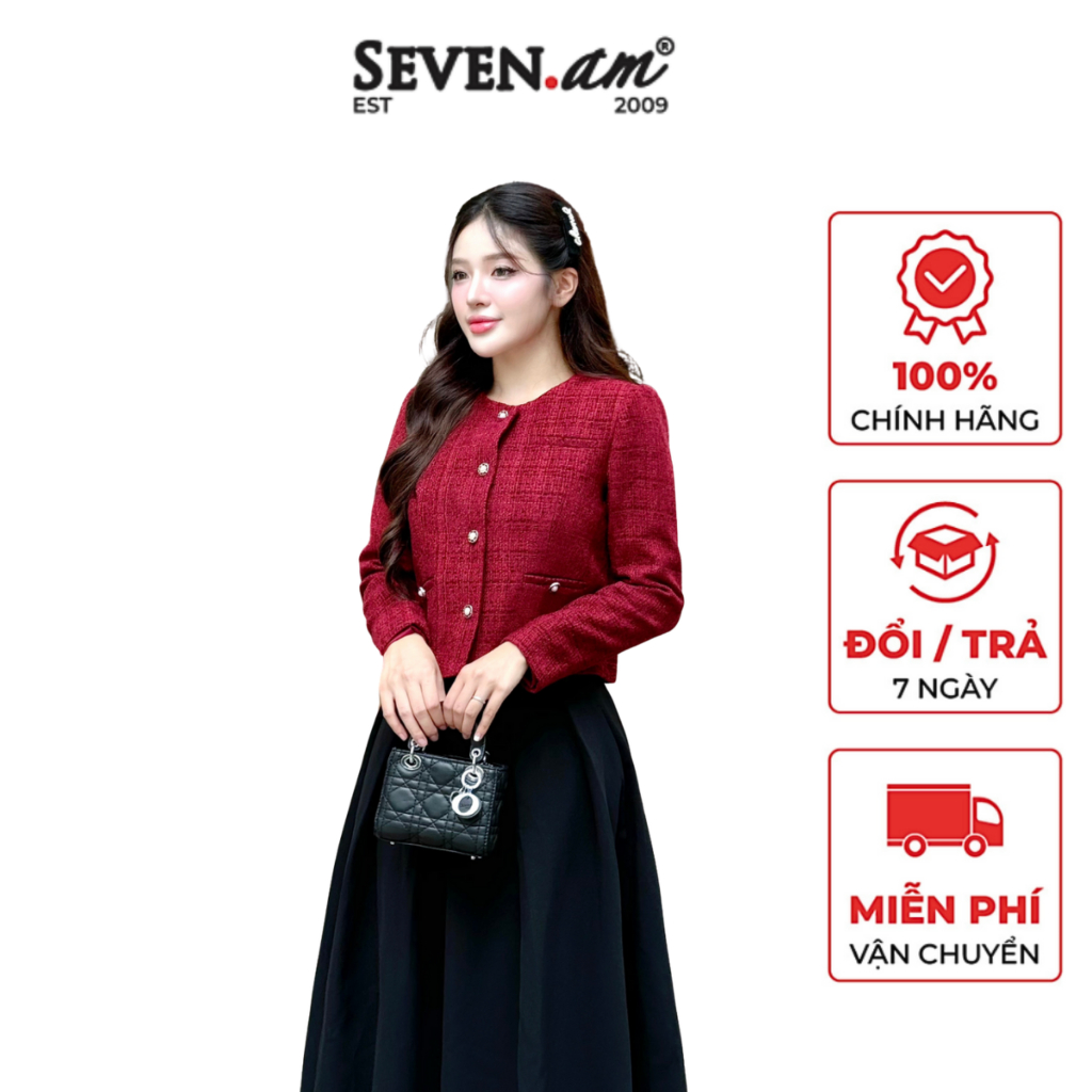 Áo khoác lửng đỏ tweed nhung phối cúc thời trang nữ Seven.AM OA0100I