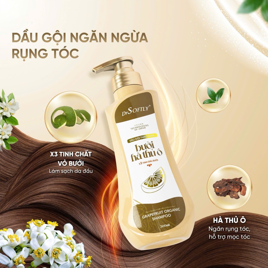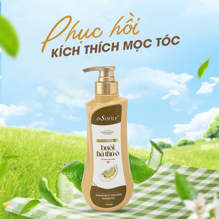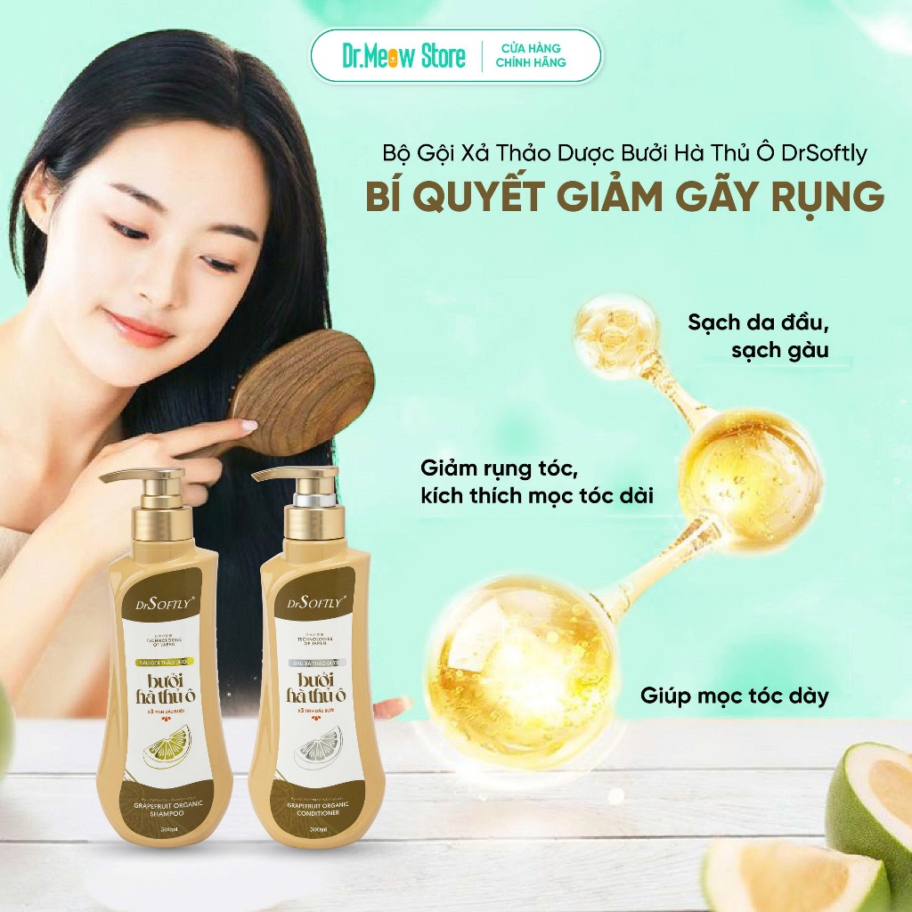 Bộ gội xả thảo dược Bưởi & Hà Thủ Ô Thuần Chay Dr.Softly, Sạch Gàu, giảm rụng an toàn cho Gia Đình