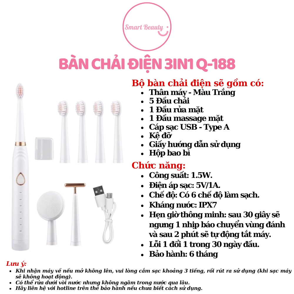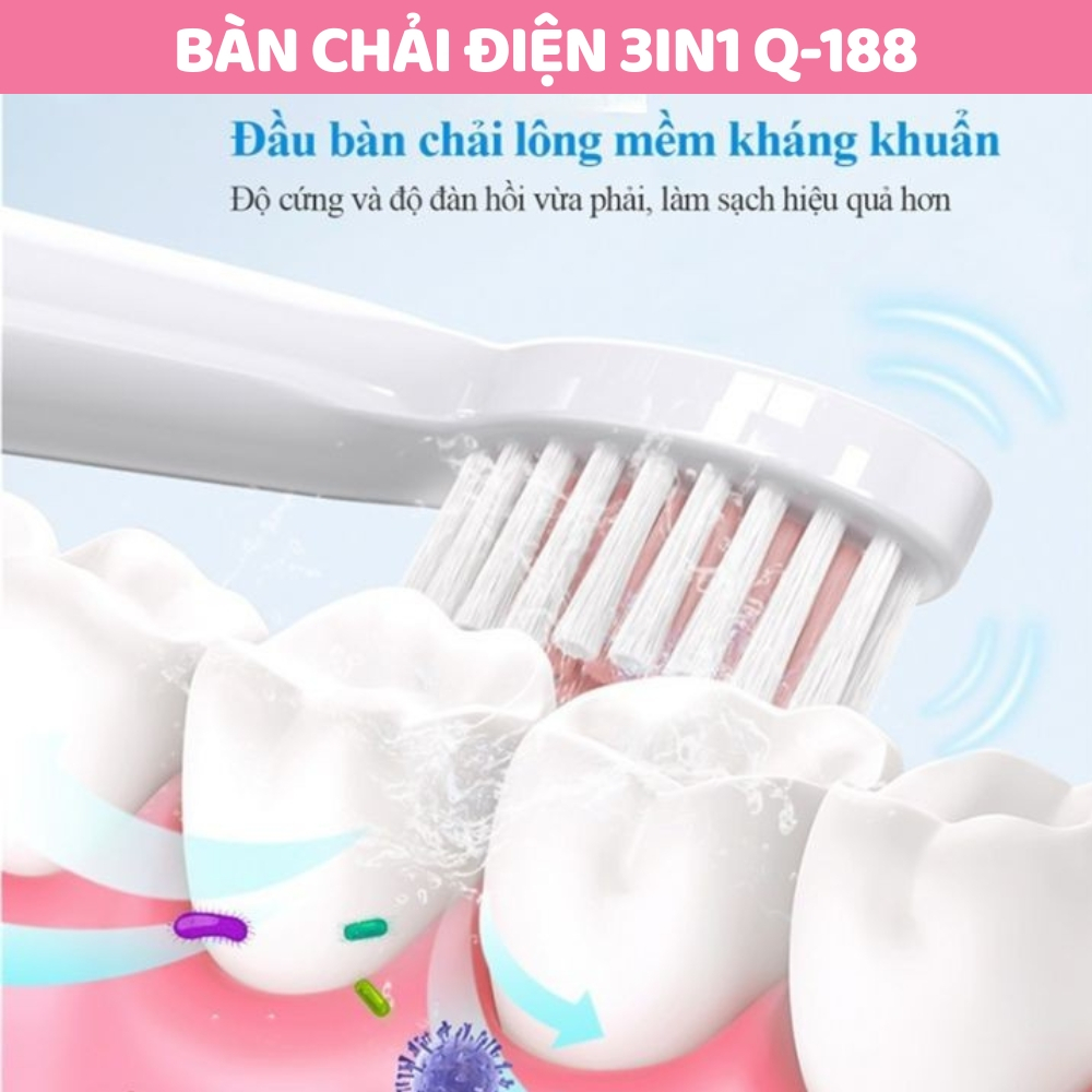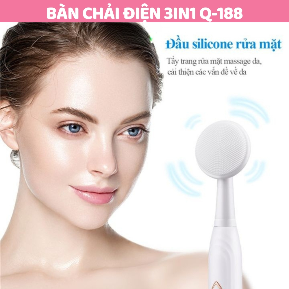 Bàn chải điện Q-188, Bàn chải 3in1 kết hợp máy rửa mặt kèm mát xa mặt, kháng nước IPX7, Đổi Mới 30 Ngày Đầu, Tặng kệ đỡ