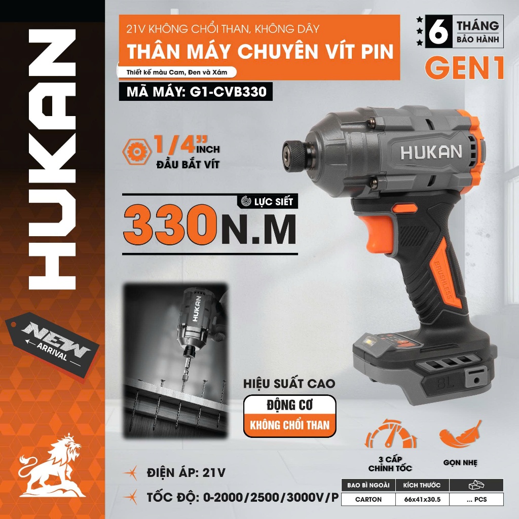Thân máy chuyên vít pin HUKAN G1-CVB330, Không chổi than, 330nm, 3 tốc độ, Đầu lục giác 6.35mm