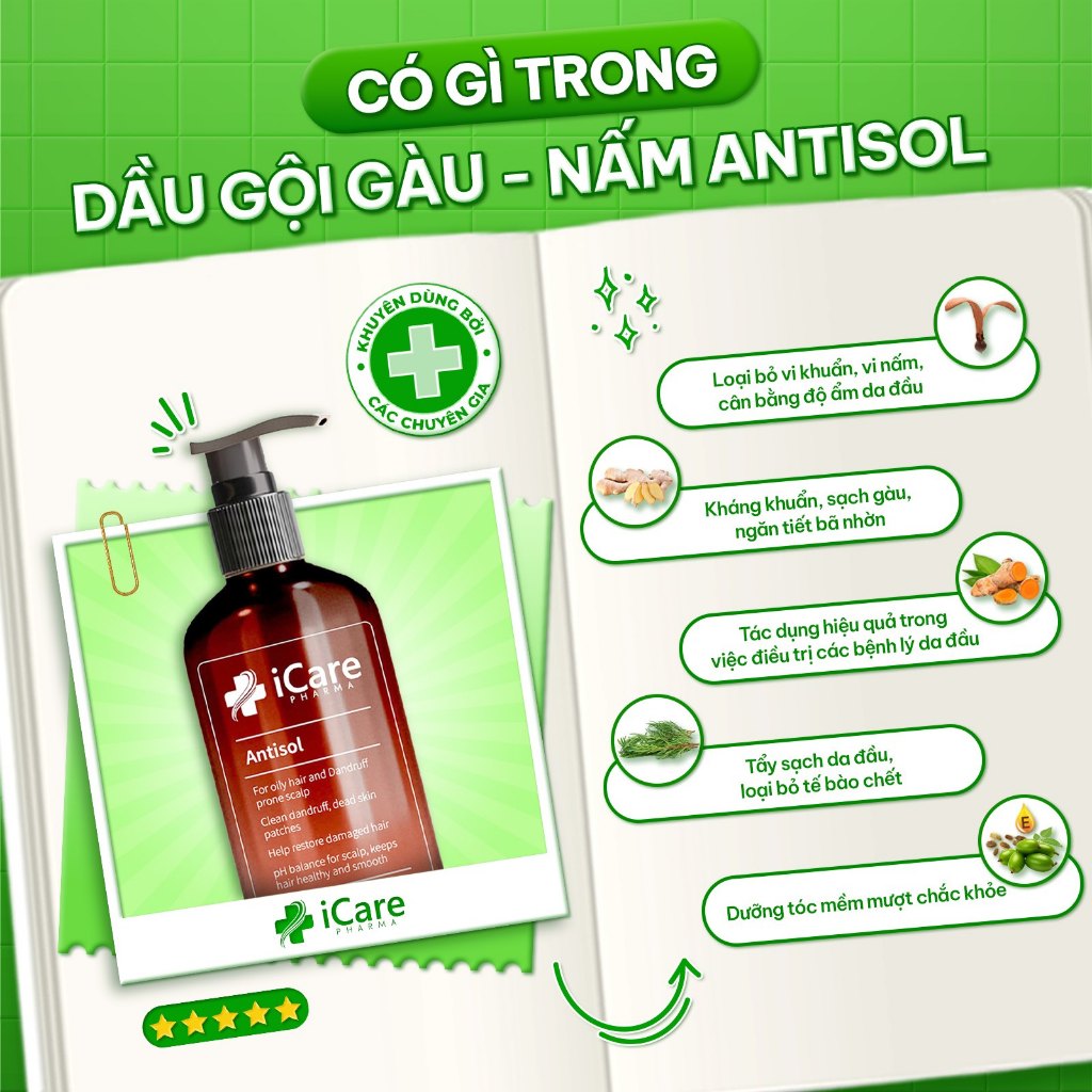 Dầu Gội iCare Pharma - Antisol Dược Liệu, Giảm Gàu Bong Thóc, Nấm, Viêm, Nhờn Ngứa, Sạch Da Dầu