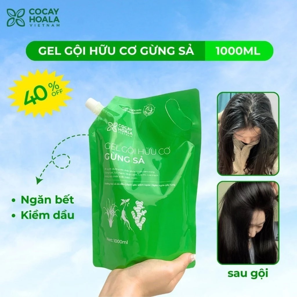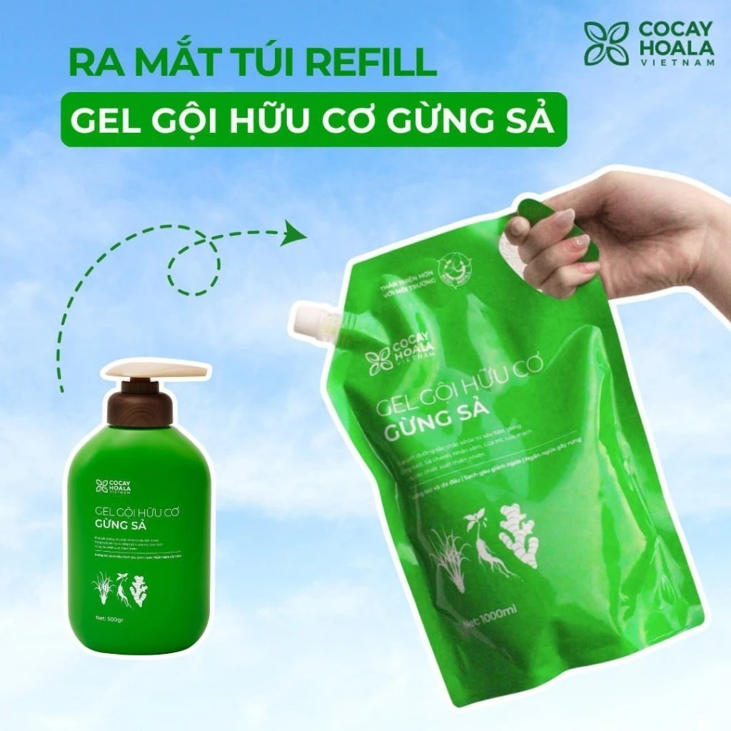 Dầu Gội Hữu Cơ Gừng Sả Cỏ Cây Hoa Lá - Ngăn dầu bết tóc và giảm gàu ngứa - Túi Refill 1000gr