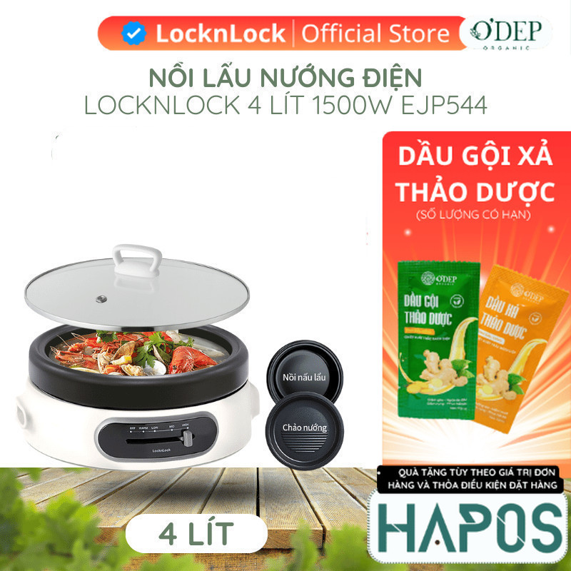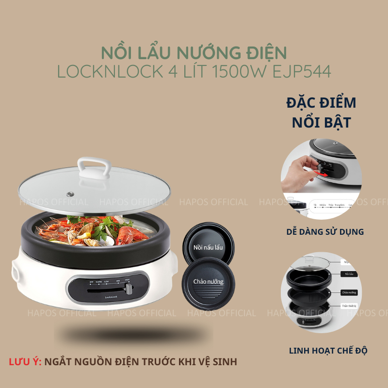 Nồi lẩu điện đa năng 4 lít 2in1 LocknLock Chính hãng, Kèm chảo nướng 1500W, lồng tháo rời dễ vệ sinh EJP544WHT - HAPOS