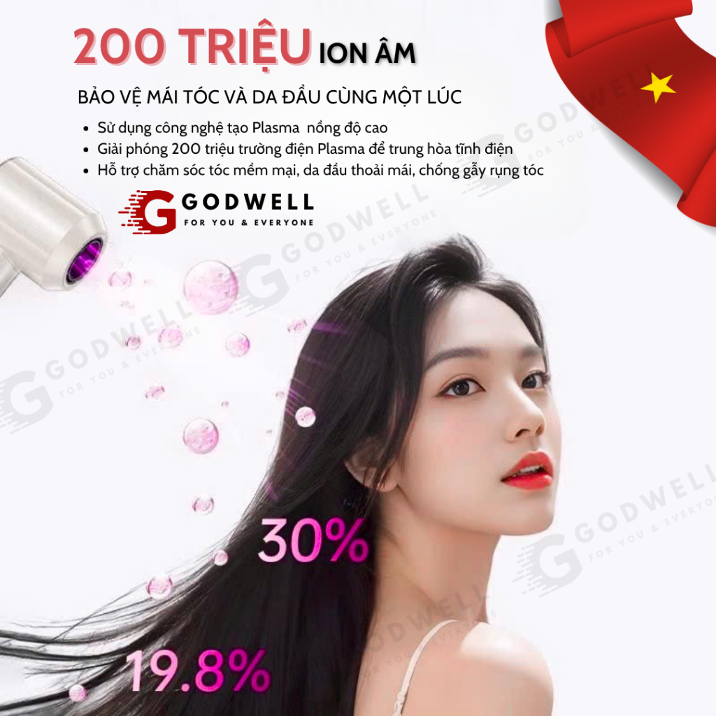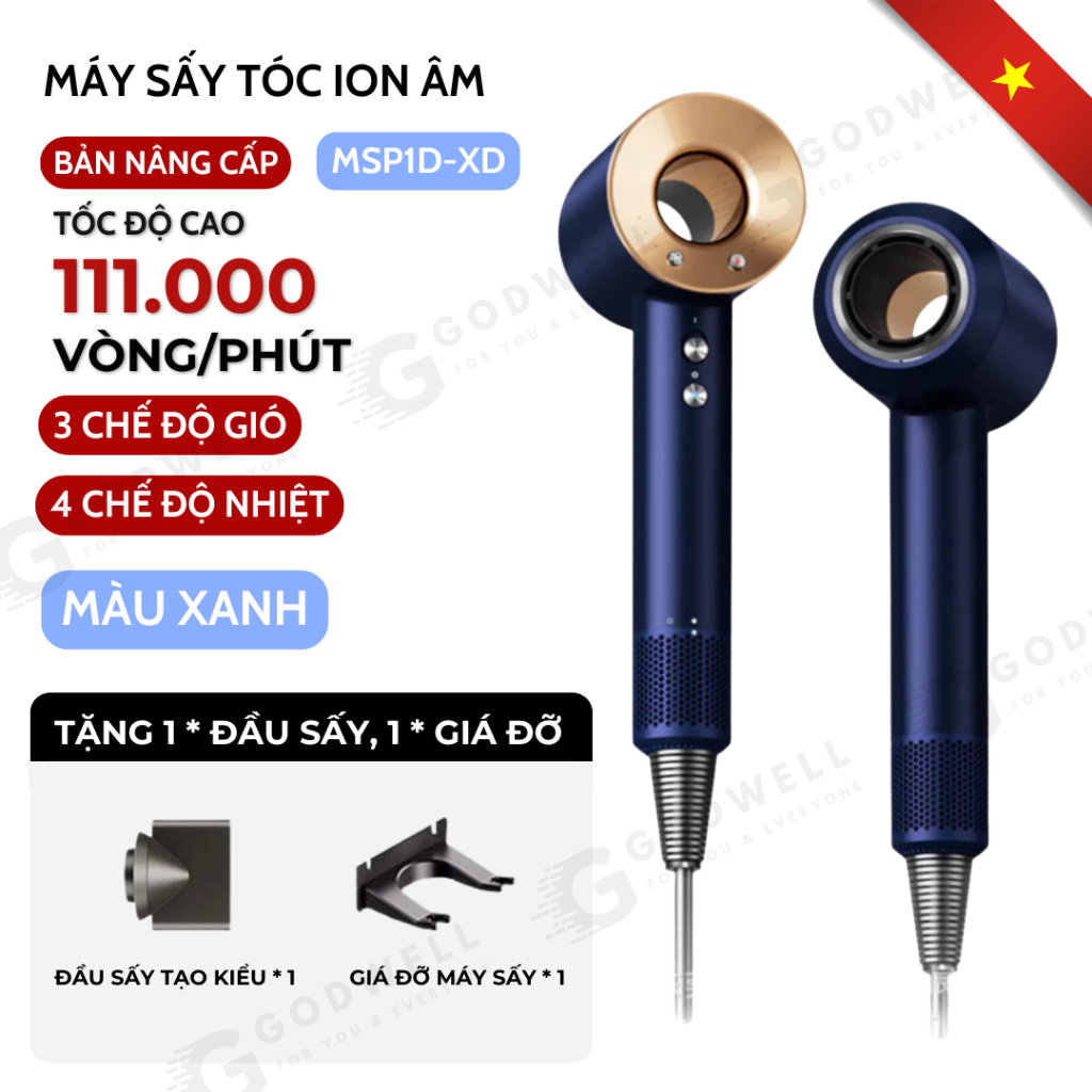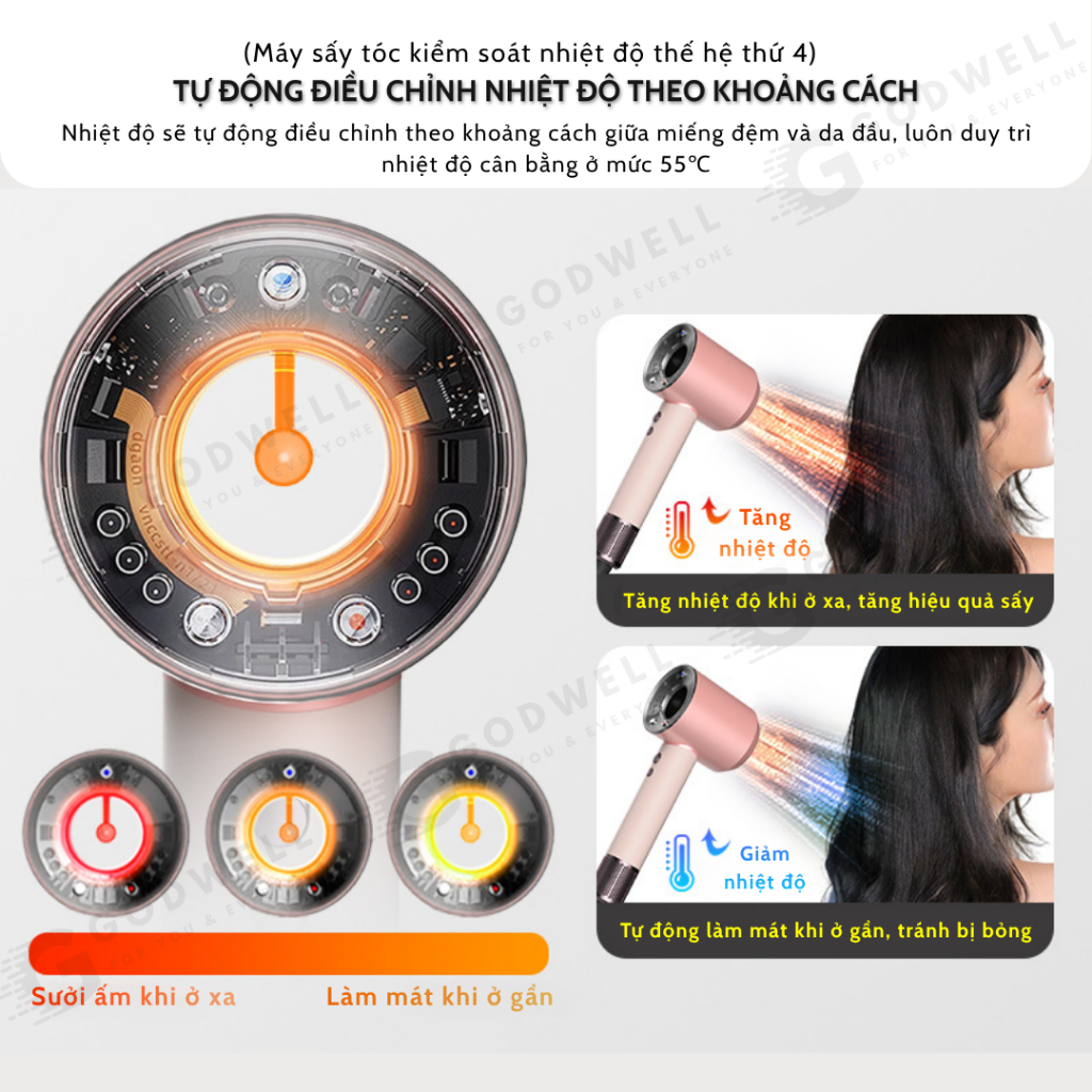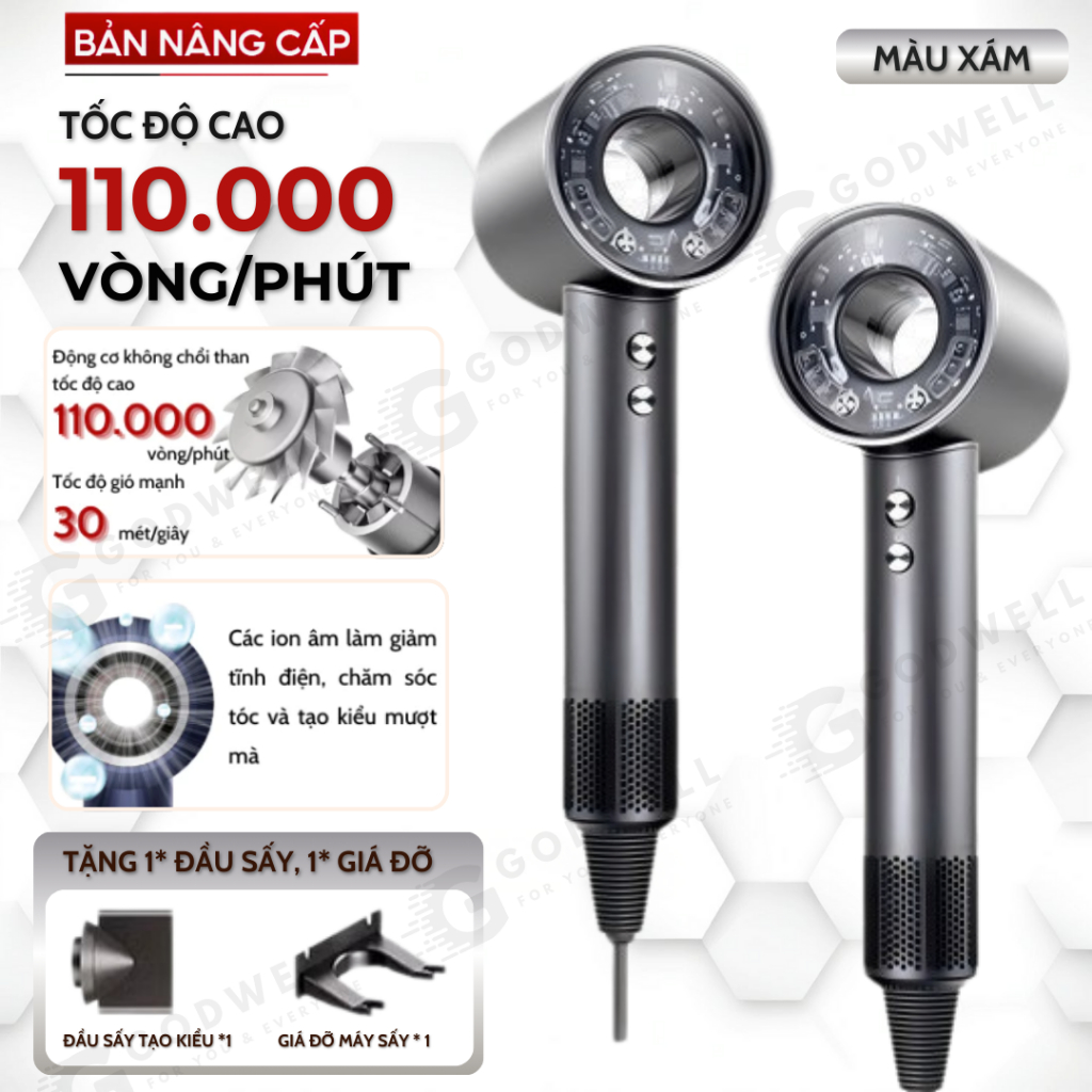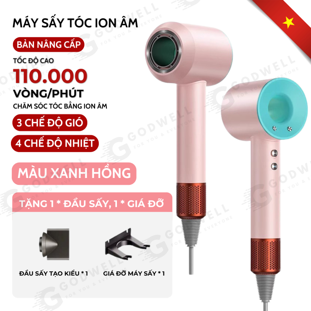 Máy Sấy Tóc Ion Âm GODWELL Không Cánh 2 Chiều Nóng Lạnh, 3 Chế Độ Sấy Mạnh Công Suất Lớn Kèm Đầu Sấy