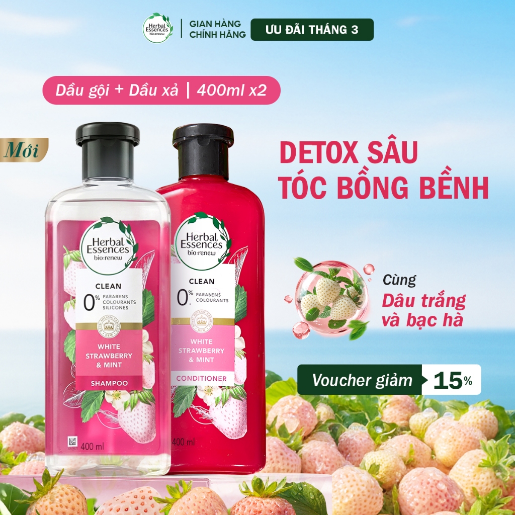 Combo dầu gội, dầu xả thiên nhiên Herbal Essences Detox sạch sâu với Dâu trắng & Bạc hà 400ml