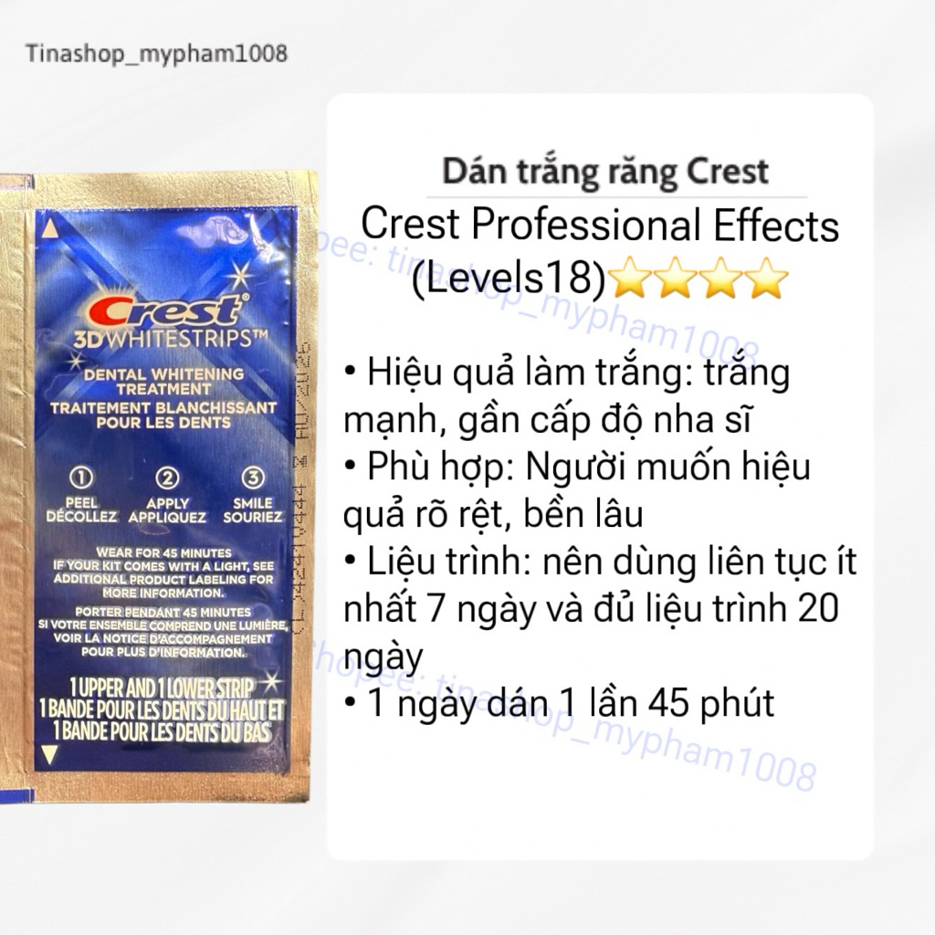 [Combo 7 gói] Miếng dán trắng răng crest 3d white supreme/ professional/ 1 hour/ glamorous/ vivid/ gentle