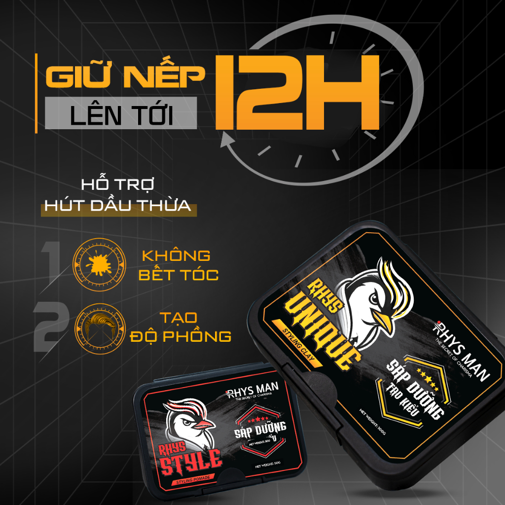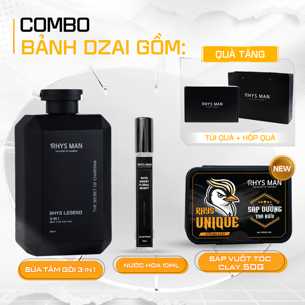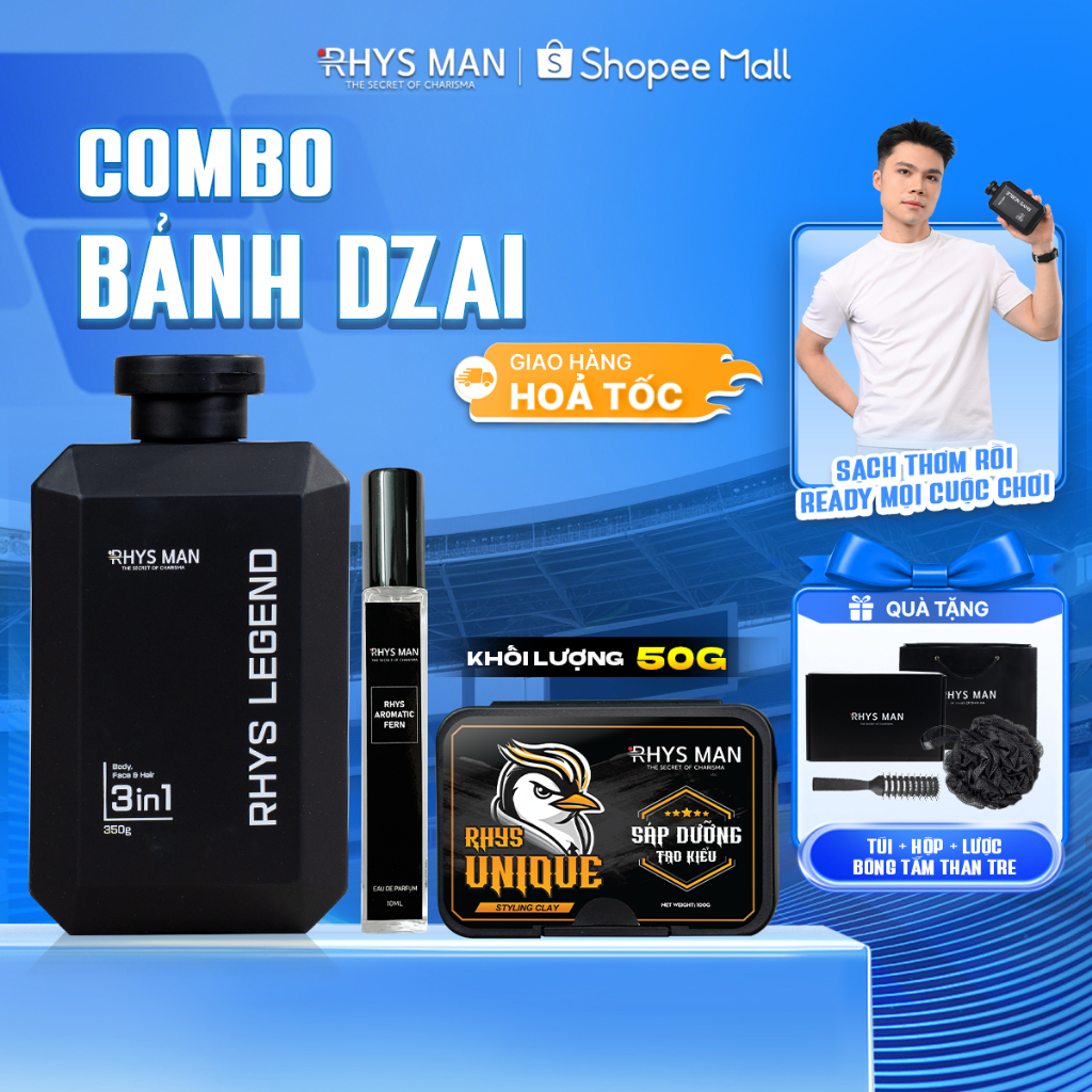 Combo Bảnh Dzai - Sữa tắm gội nam 3in1 350ml & Sáp dưỡng tạo kiểu tóc 50g & Nước hoa nam 10ml Rhys Man