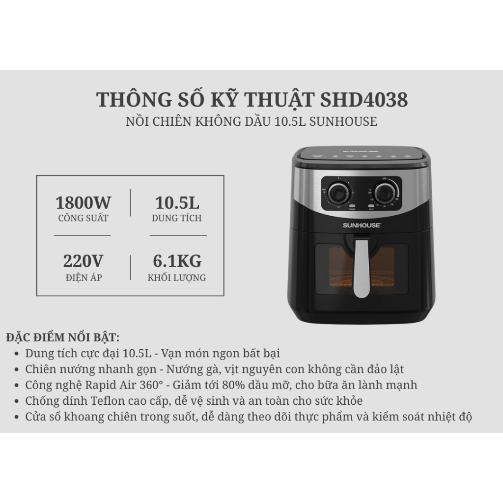 NỒI CHIÊN KHÔNG DẦU SUNHOUSE SHD4035 - Dung tích siêu lớn | Tự ngắt điện khi quá tải | BH 12 tháng