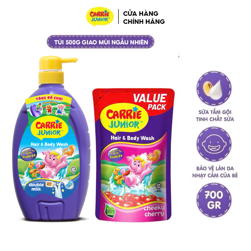 [MỚI - Tặng đồ chơi bắn vòng nước] Chai Sữa Tắm Gội cho bé Carrie Junior thiên nhiên 700g (Tặng màu ngẫu nhiên) - LIVE